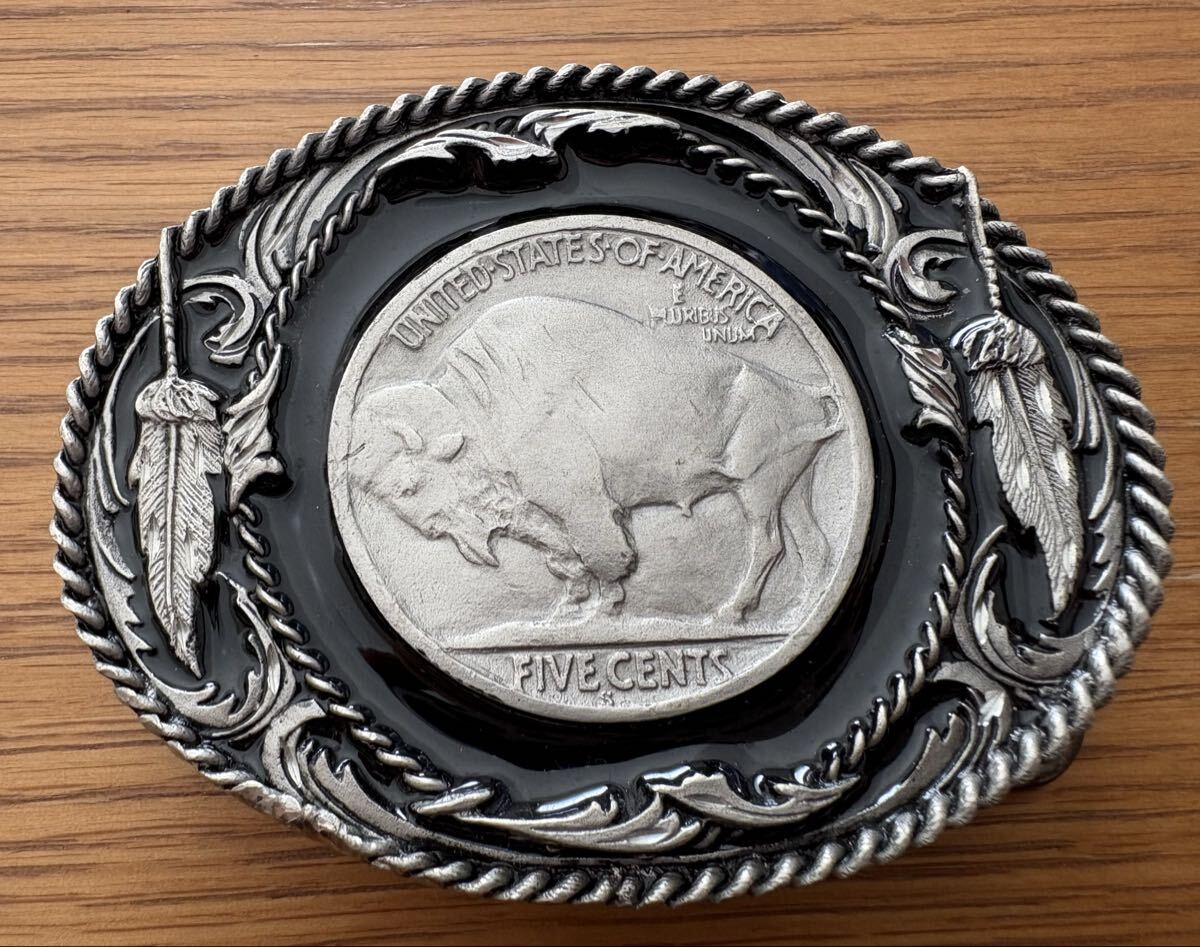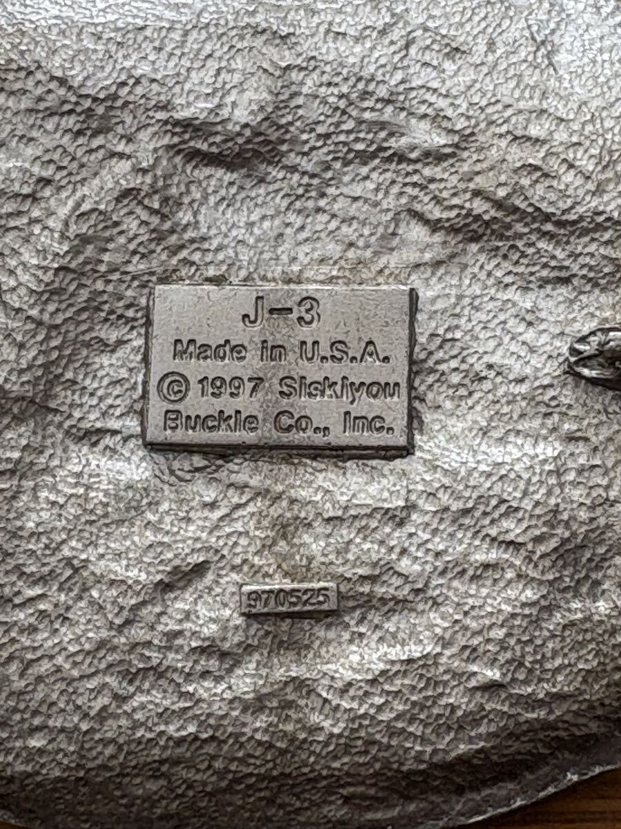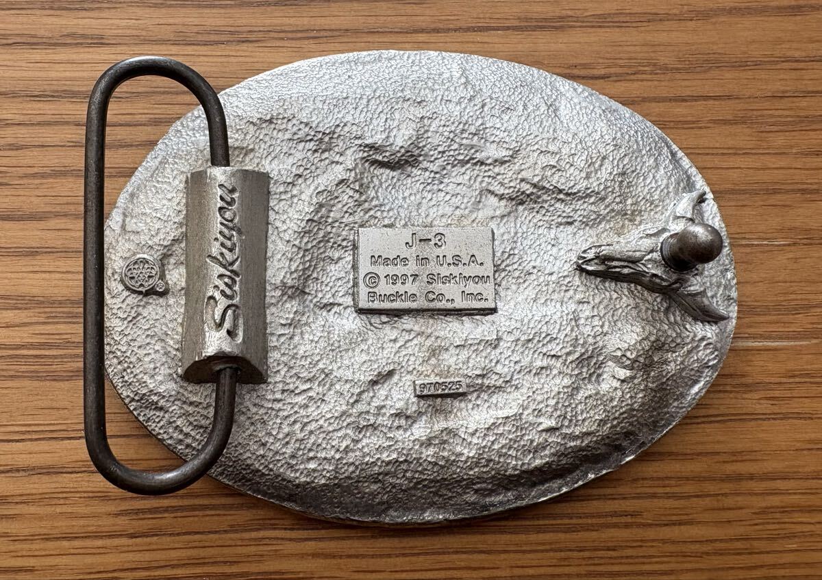アメリカ Siskiyou Buckle Co.社製、1997年製造のバッファローニッケルをモチーフにしたビンテージベルトバックルです。裏面には『J-3』『Made in U.S.A.』の刻印とSiskiyou公式ロゴ入り、本物の証拠となるシリアル番号も確認できます。シスキューならではの重厚な彫刻と西部調デザイン、フェザー&ロープ装飾が美しい一品。デニムやカジュアルファッション、コレクション用にもおすすめです。アメリカ現地のコレクターにも人気の高い希少モデルです。」