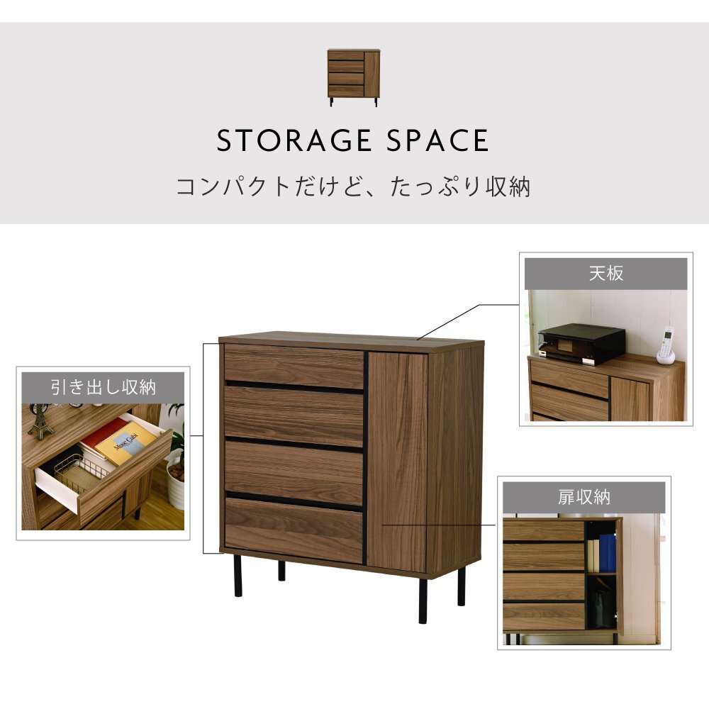 落ち着いた木目調のブラウンとブラックスチールの組み合わせがモダンな印象を与える、 北欧テイストシリーズ“Fresser”。 4段のチェストに扉収納がついたワイドチェストは、シンプルだからこそ使いやすいアイテムです。 |
