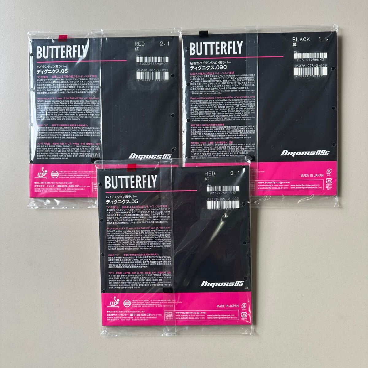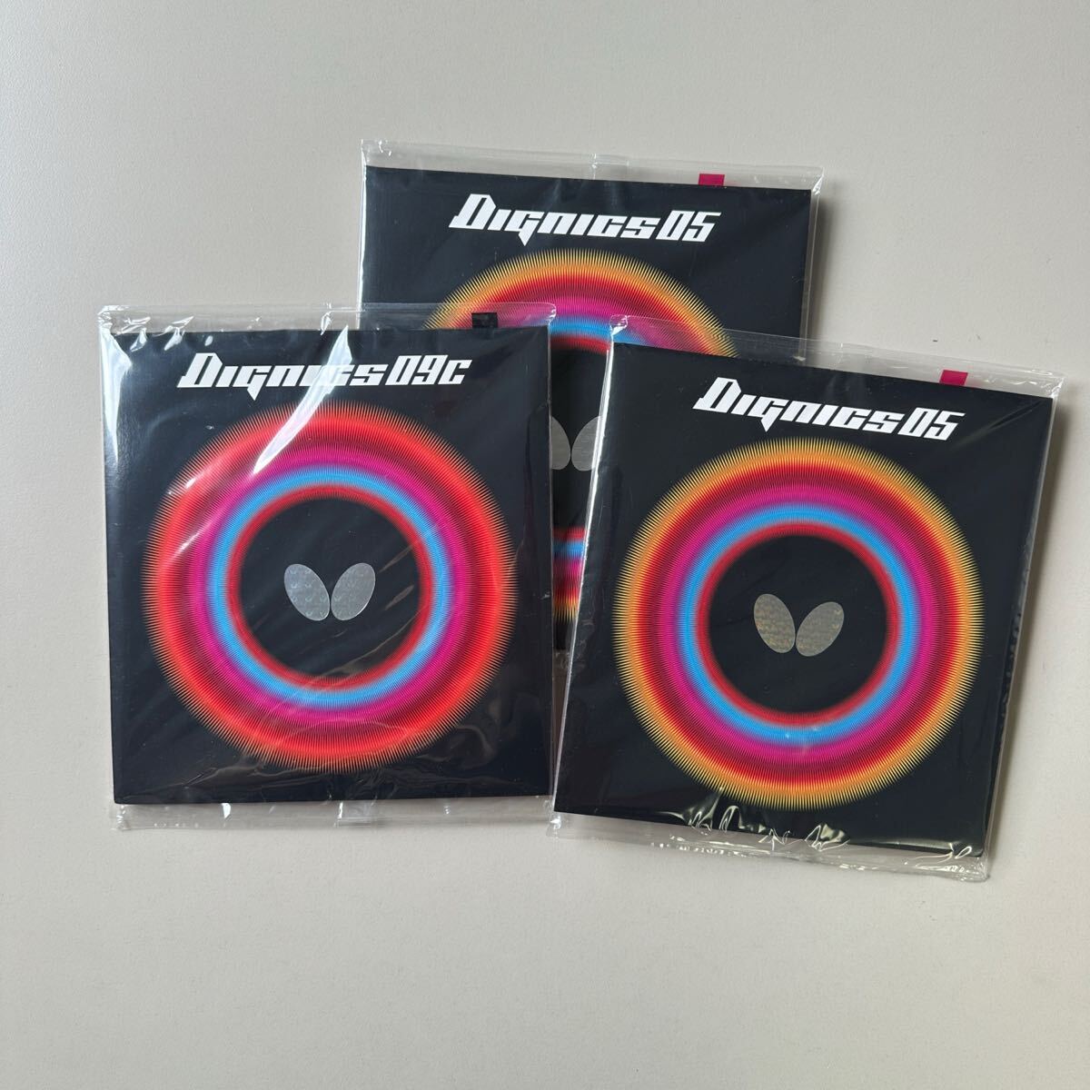 卓球ラバー「Butterfly DIGNICS 05」2枚(赤・厚さ2.1mm)と「DIGNICS 09c」1枚(黒・厚さ1.9mm)の3枚セットの出品です。