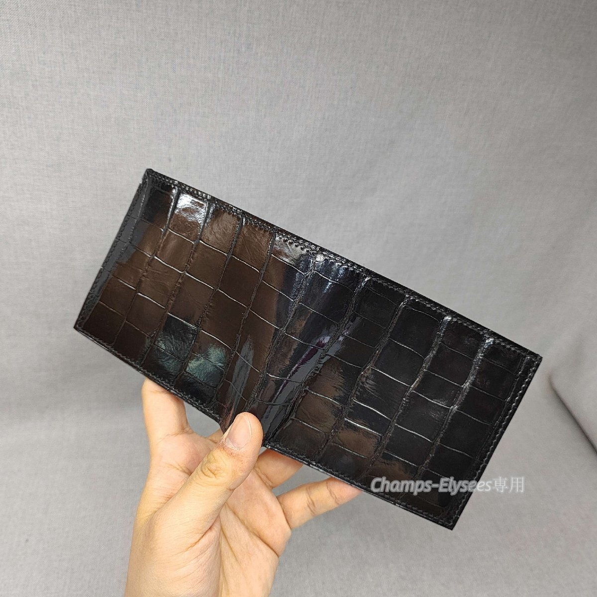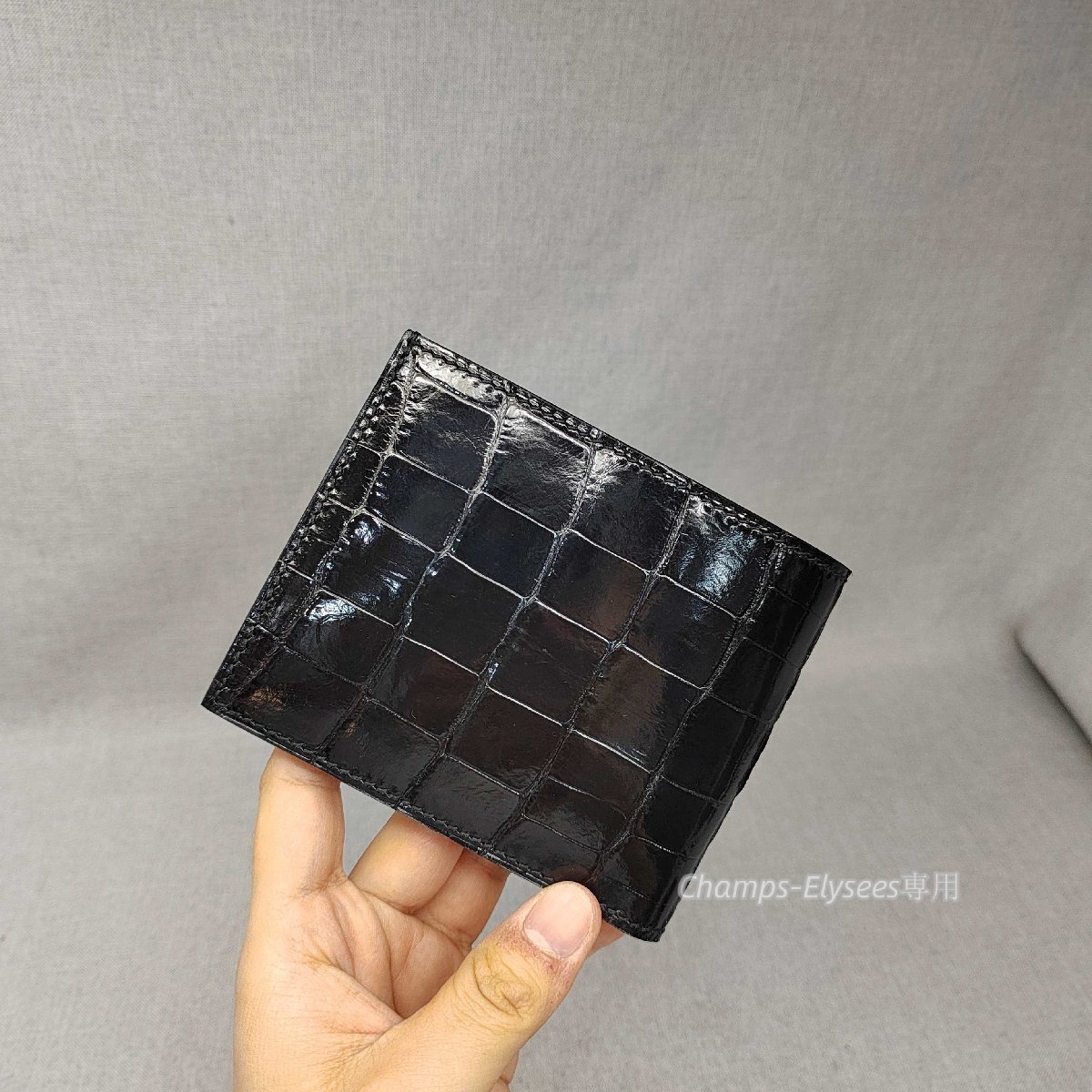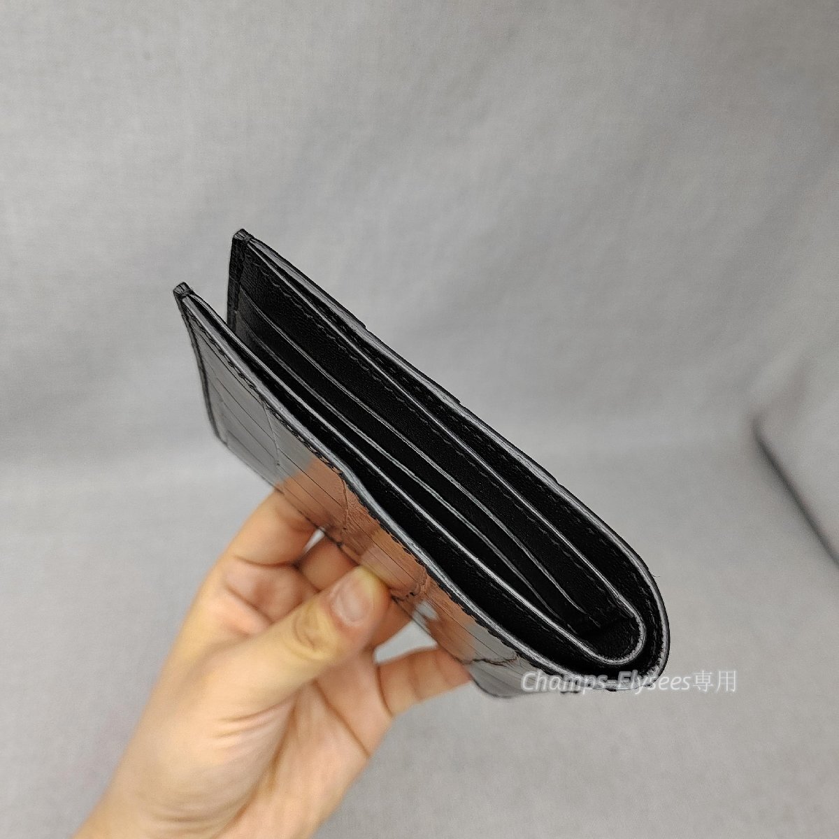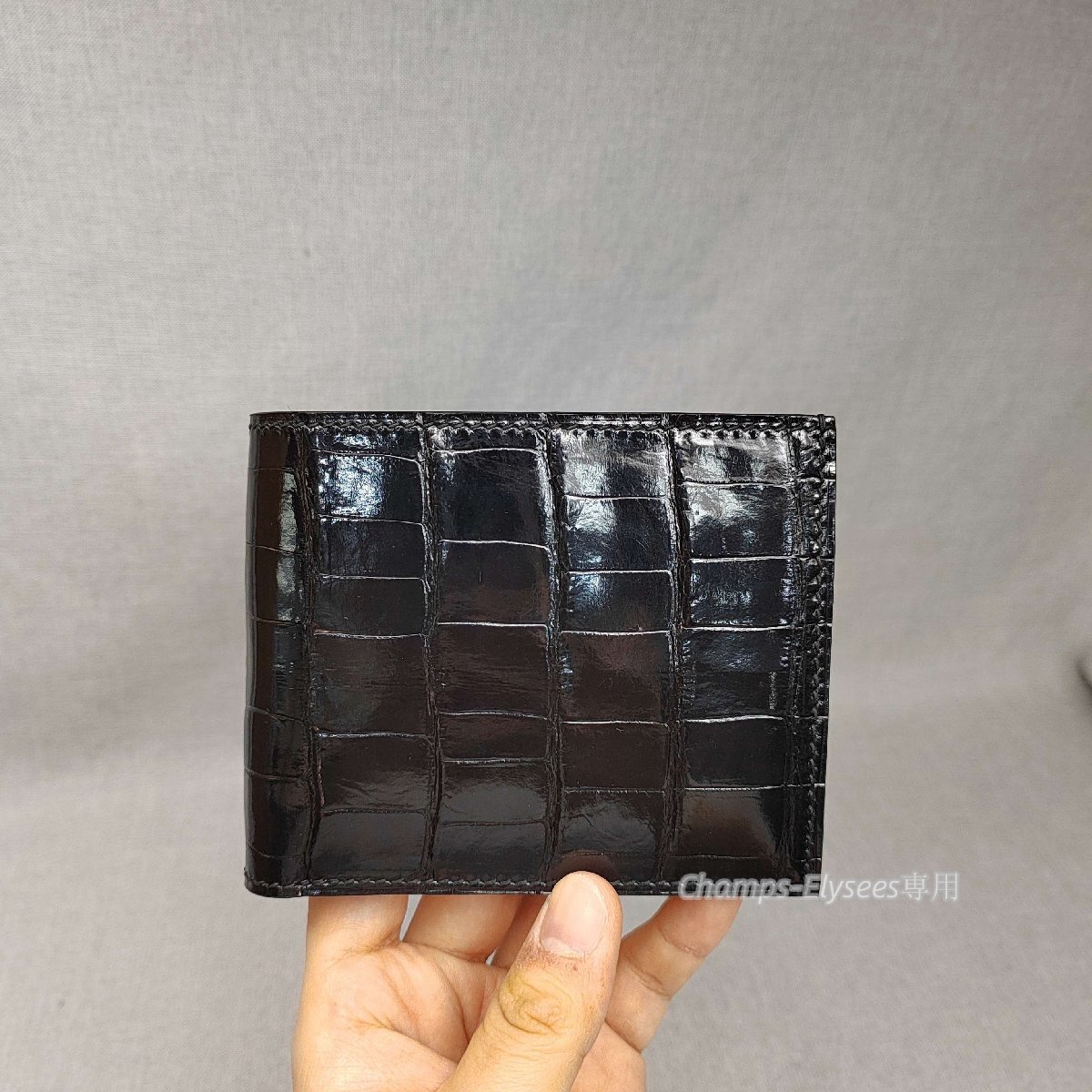 高級 クロコダイルレザー 財布 本物鰐革 シャイニング加工 二つ折り財布 カード入れ ミニ財布 黒