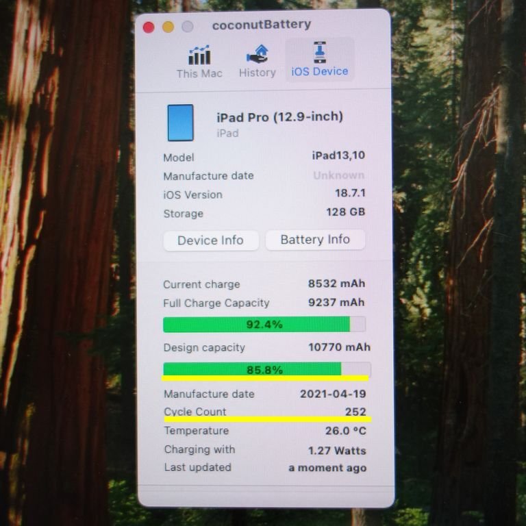 最大容量 85.8% 充電回数252回 パソコンのバッテリーソフトで計測