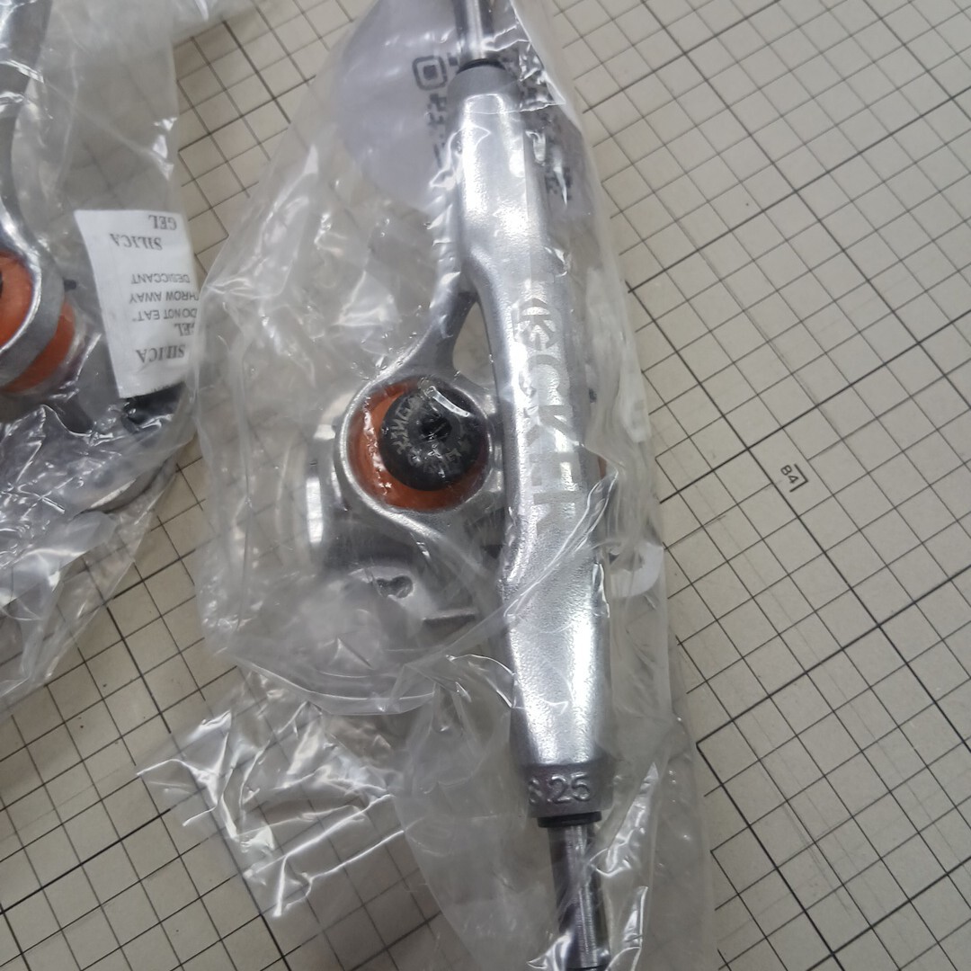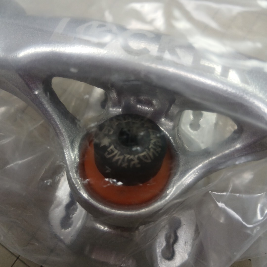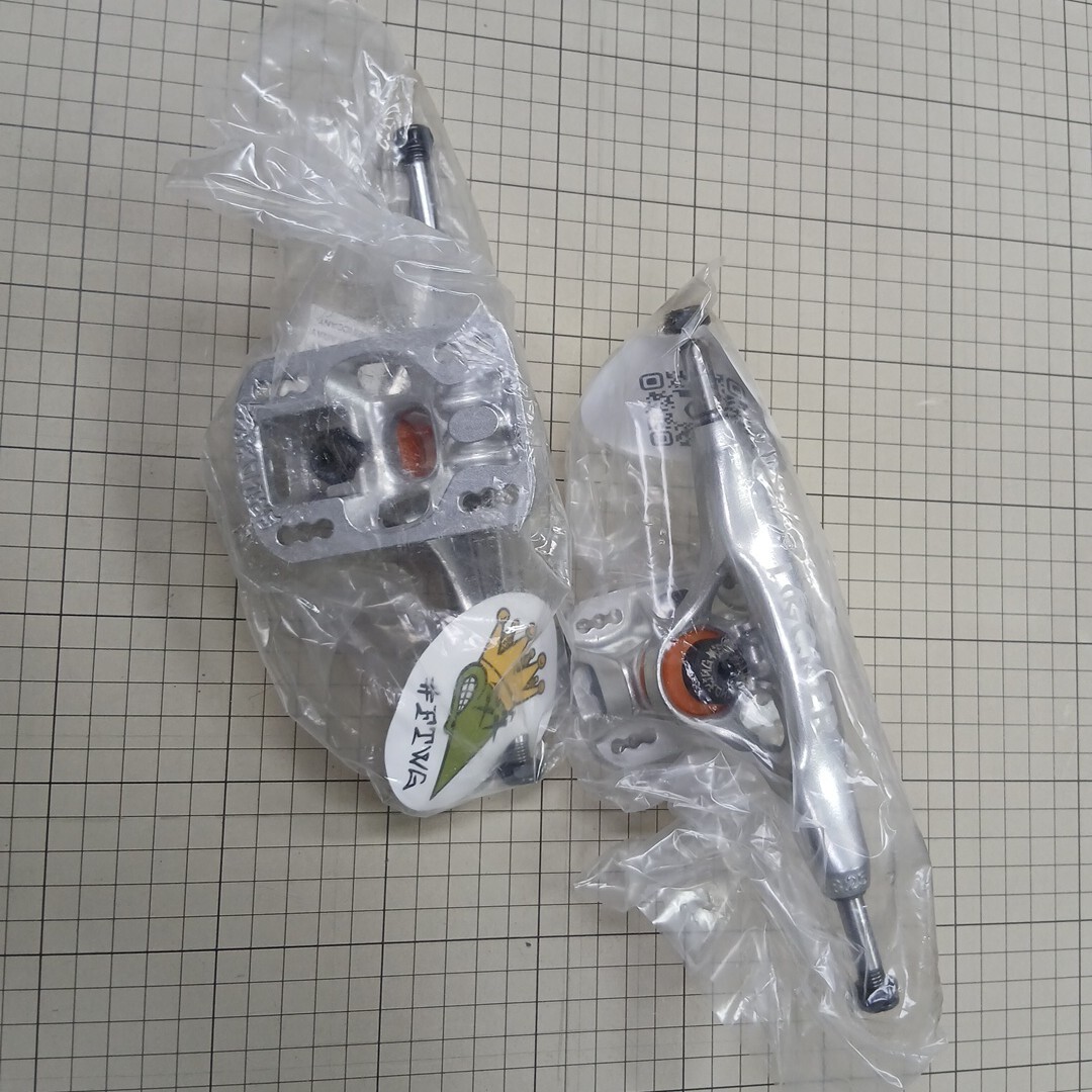 インディペンデントスタンダードより15%軽量(チタン同様)、インバートキングピン、ノーマルブッシュで4タイプのセッティング、バイトしにくい、ウィールベース移動可能、アクスルシャフトU字型デッキ寄り、ワイドベースプレートで乗り心地着地軽減、ロック式ハンガー形状など。