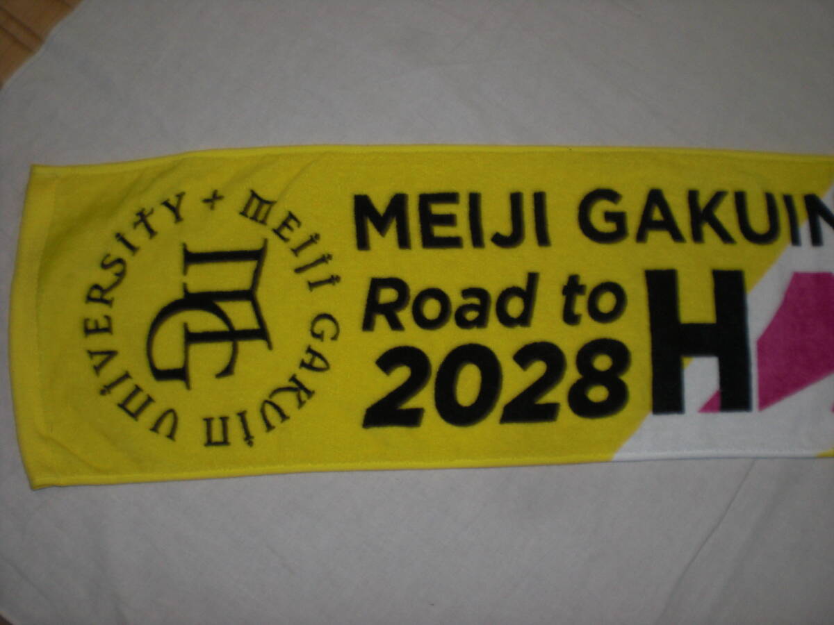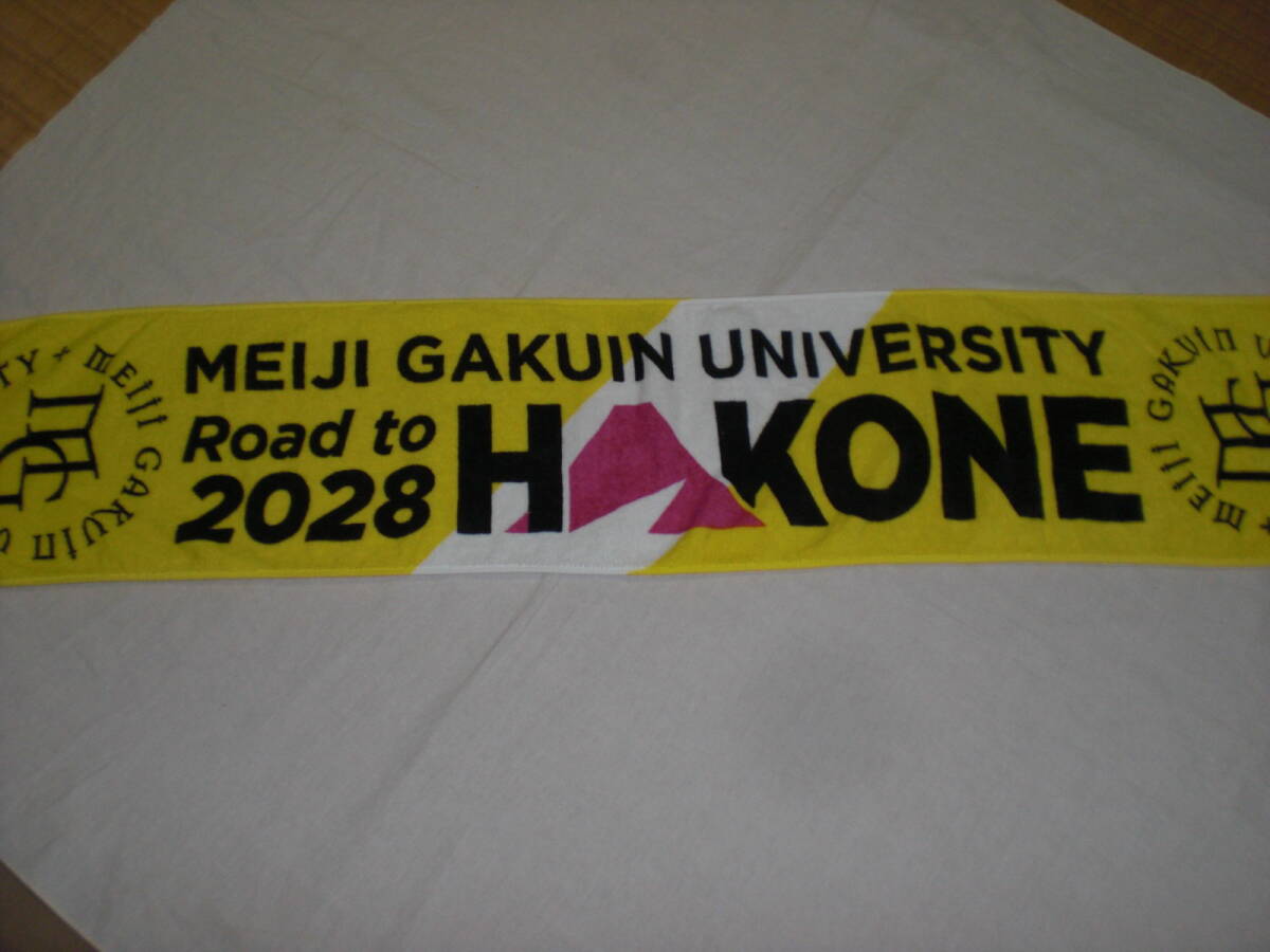 2028年箱根駅伝出場を目指す明治学院大学のタオルマフラー。日本製。綿100%。サイズ:111×21㎝。未使用品です。なお画像の黒いボカシはカメラの不具合によるものです。