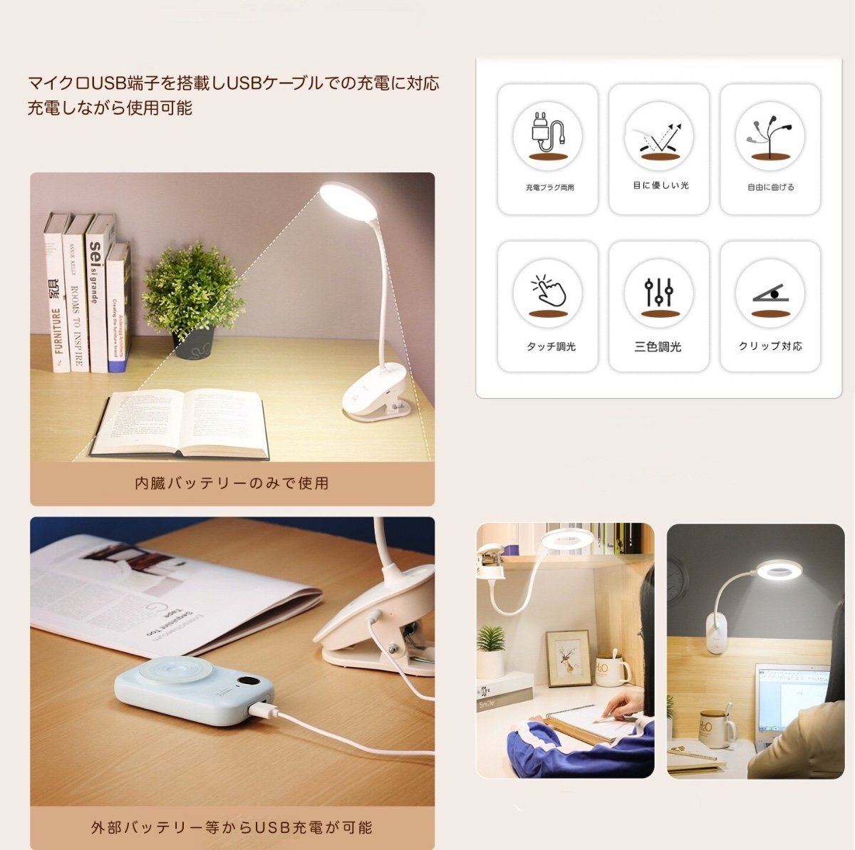 【vaps_6】クリップライト デスクライト LED USB充電式 3段階調光 コードレス 360度調整アーム 目に優しい光 送込