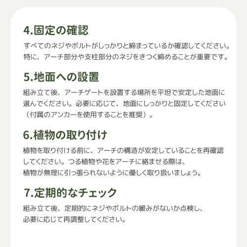 • ◎04 アンカーピン12本付きガーデンアーチの転倒を防ぐアンカーピン付き。 地面にしっかり固定できるため、安定感抜群! 庭やエントランスに設置してもグラつきにくく、美しいお庭を長く楽しめます。ご注意:風の影響を受けやすい場所に設置する場合や、強風が予想される場合は、アンカーピンだけでは完全に転倒を防ぐことができない可能性があります。お客様の判断で別途転倒防止策を施してください。