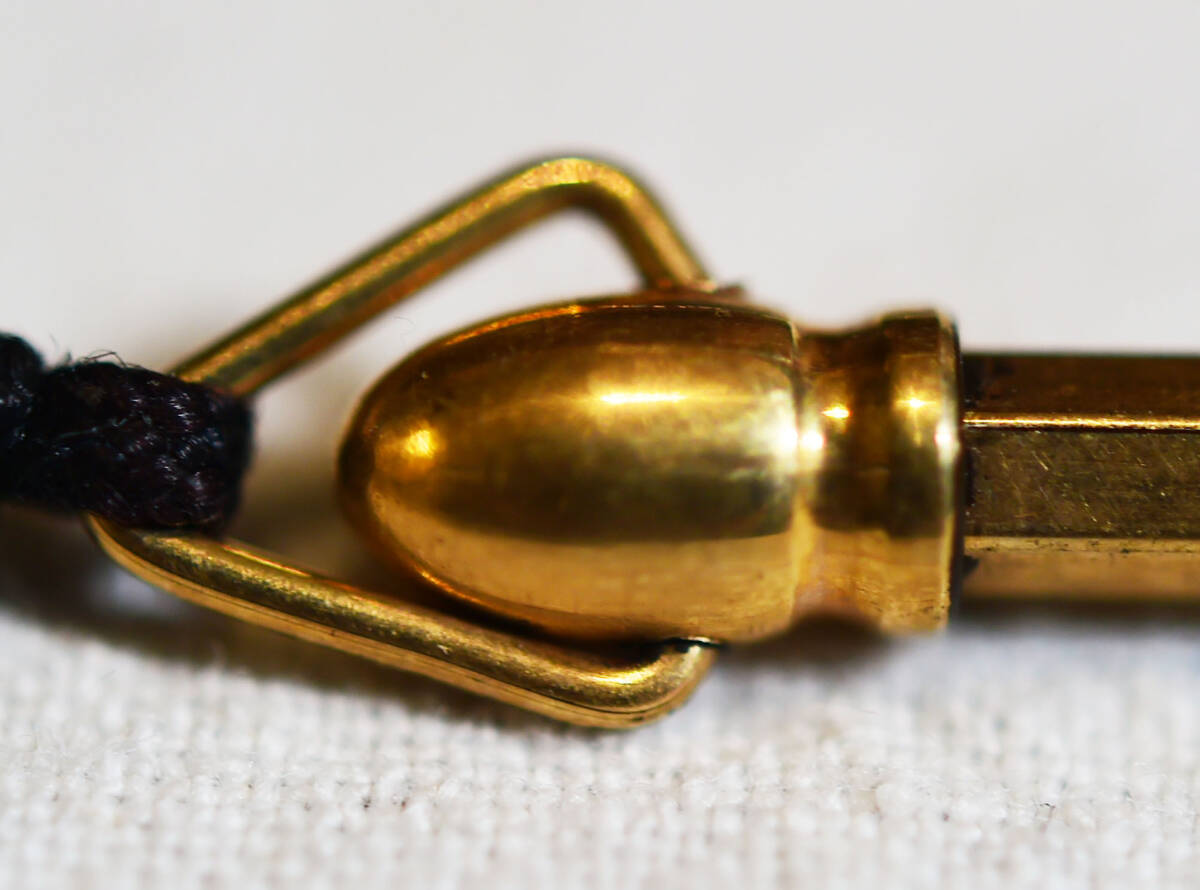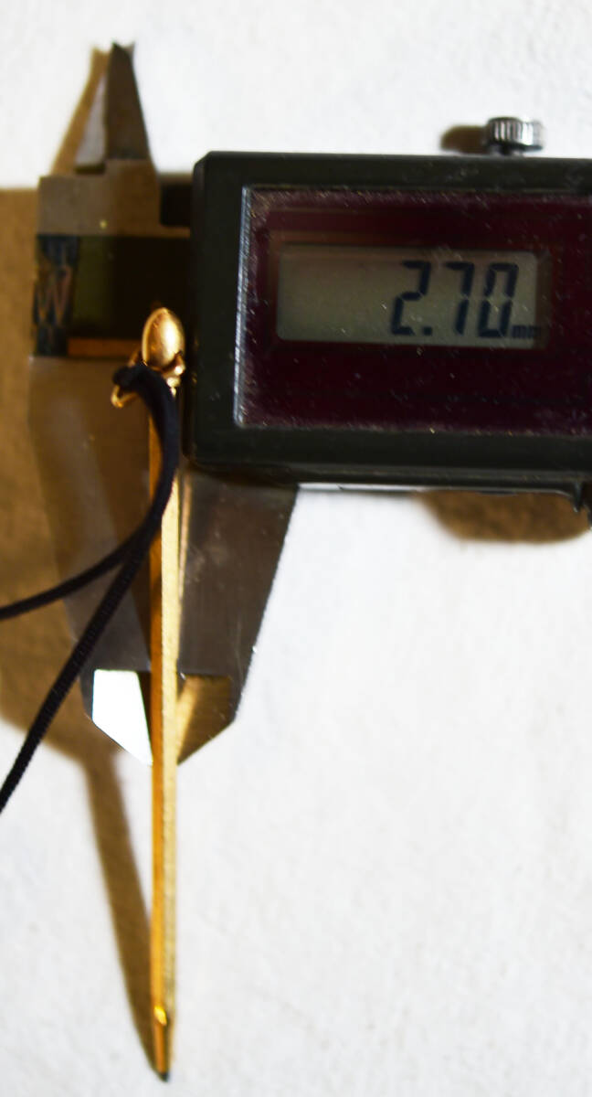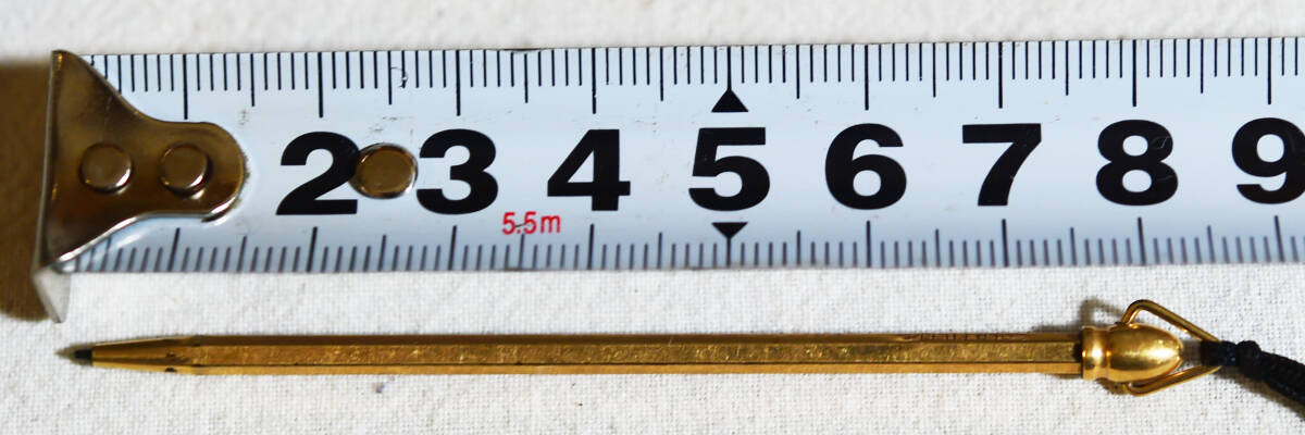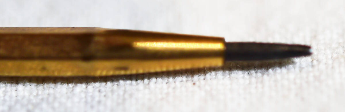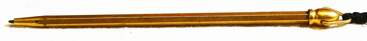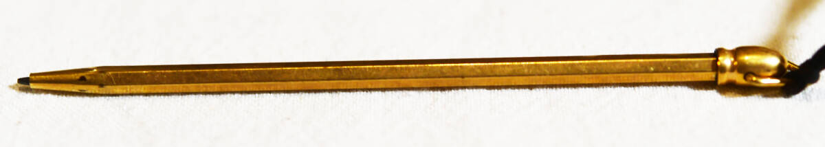 本体太さ2,7mm,芯の太さ1,13mm.頭部を回転させると芯が出るタイプです。本体にはGOLD FILLEDの刻印が有りますが、メーカー名等は無い様です。芯はまだ残りがありますが何処で購入したら良いのか判明しません。思ったよりも細くて小さい、コレクションに。