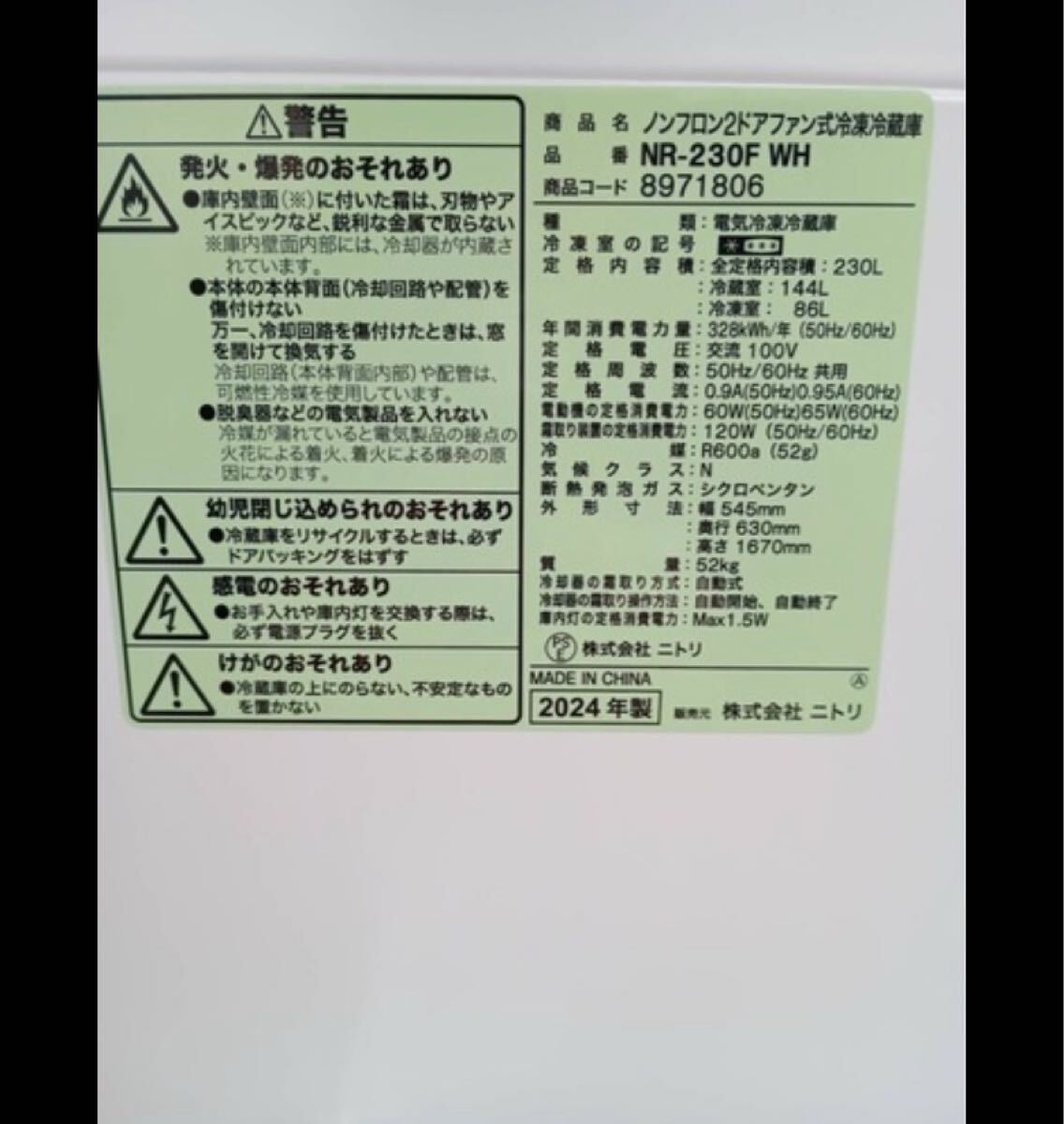 ニトリ大きめ2ドア冷蔵庫です。2024年高年式で綺麗です!