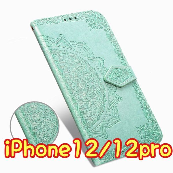 エンボス加工スマホケース 手帳型 iPhone12/12pro グリーン
