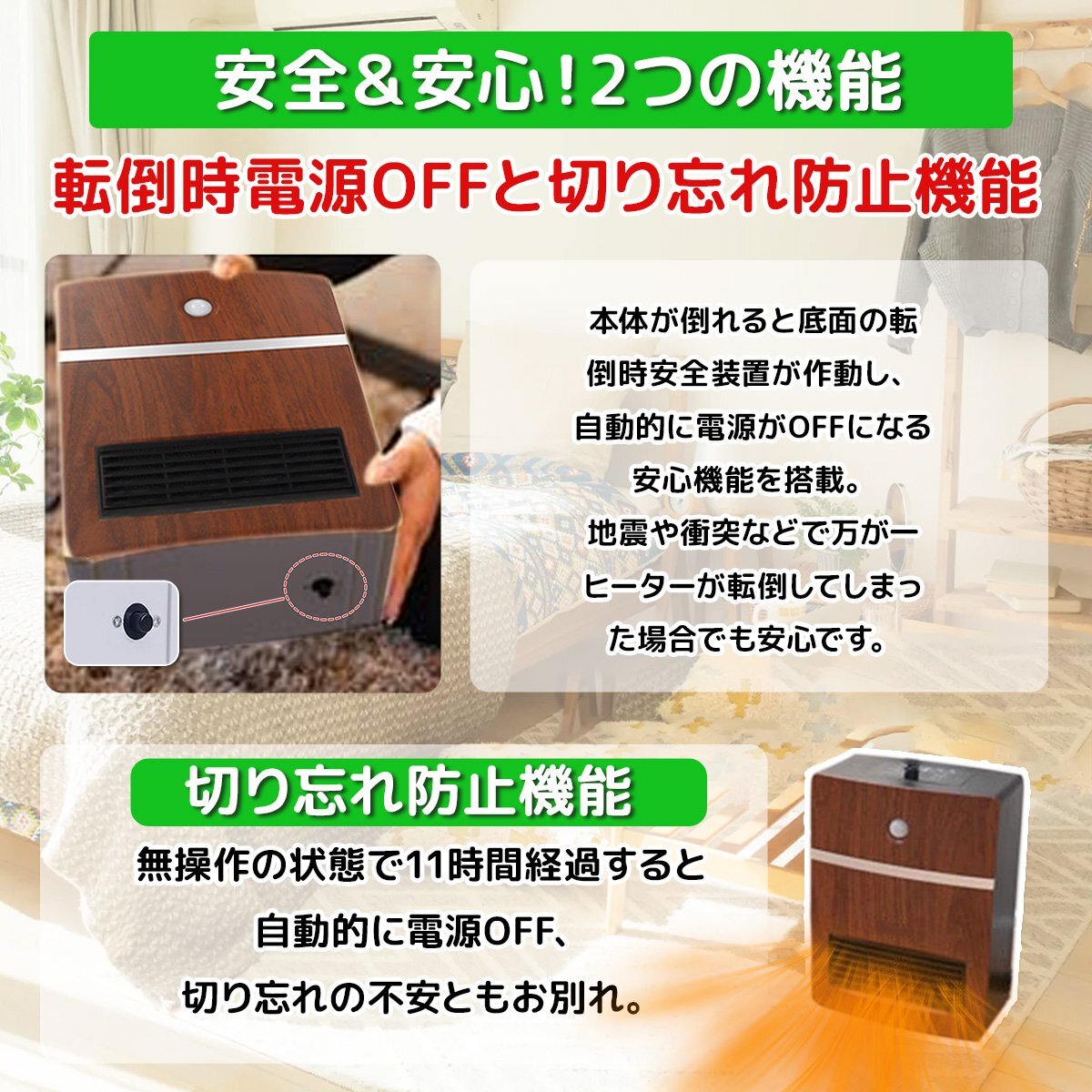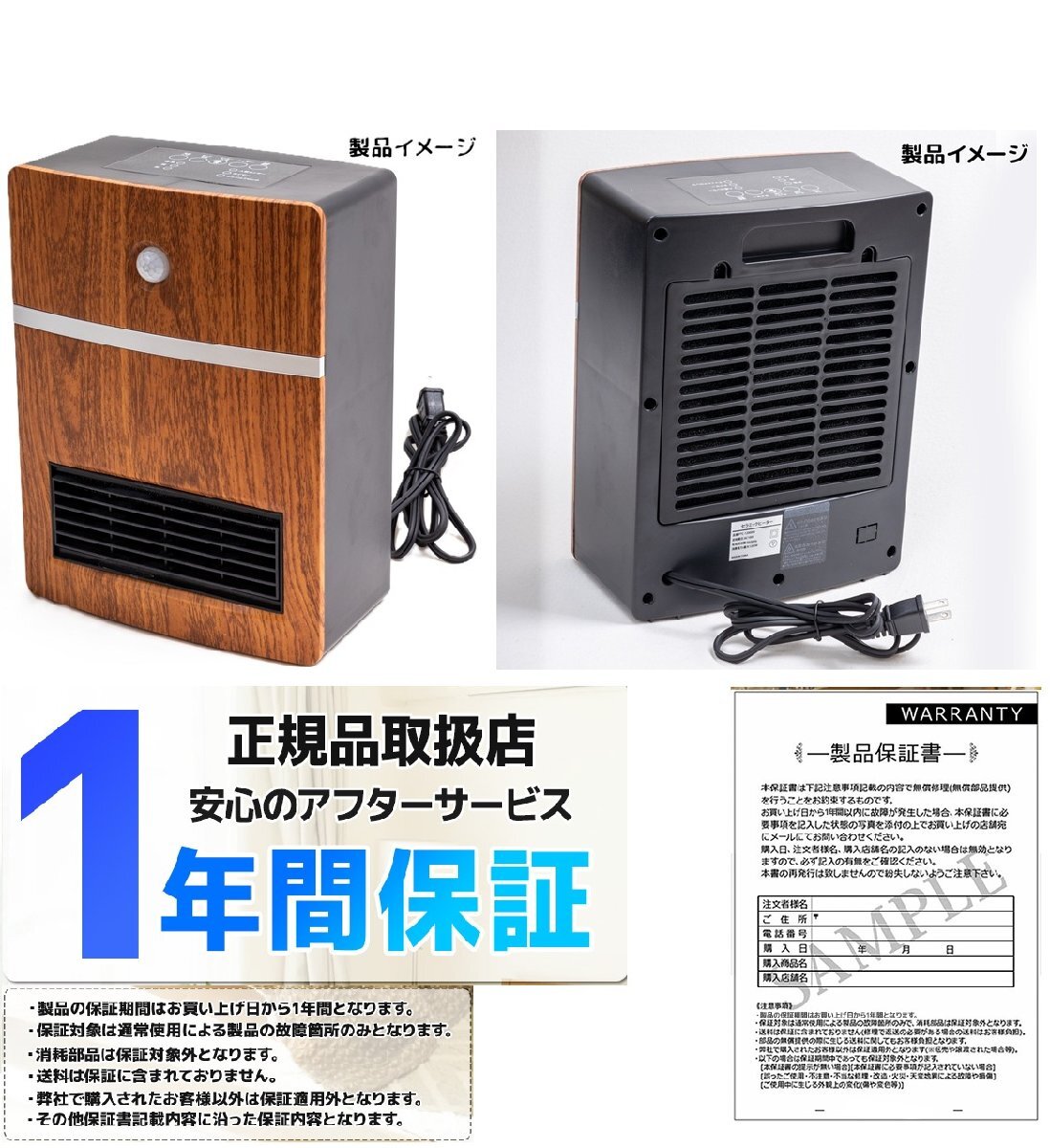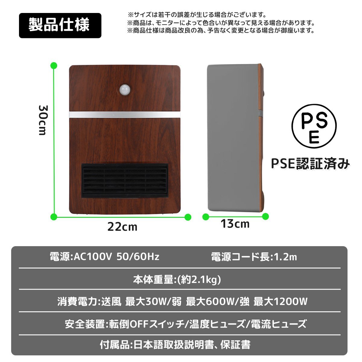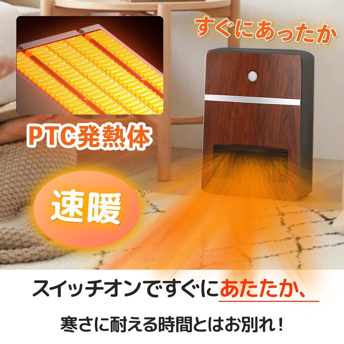 | 商品の詳細 | ハイパーミックス技術を活用し、電熱転換率の高いPTCセラミックファンヒーターです。 ●即暖!スイッチを入れて約3秒でぽかぽか実感♪ ●デスクワーク中の手元や足元、トイレや脱衣所などの狭いスペースなど、 使う場所を選ばないコンパクトヒーターは自分の行動に合わせて持ち運べるので寒い冬を 快適に過ごすための便利なアイテム♪ ●上部のタッチ式ボタンで簡単に操作OK! ●人感センサーがついていて離れると自動にオフするので、電源切り忘れた日も発火する心配がなく気楽です。 ●過加熱防止機能、転倒時自動電源OFF機能など安全にお使いいただける機能を搭載しています♪ 【製品仕様】 定格電圧:AC 100V 定格周波数:50/60Hz 人感センサー距離:6m 電源コード:1.5m 本体サイズ:300*220*130mm 消費電力:高温:1200W 中温:600W 送風:30W 支払詳細 | ①UFJ銀行 ②ゆうちょ銀行 ③商品代引き ④楽天銀行決済 ⑤PayPayPayPay⑥クレジットカード⑦ヤフーカード Visa Mastercard JCB Diners American Expressの中からご自由に、お客様のご都合に合わせて選べる決済です。 | 発送詳細 | ・こちらの商品は基本送料無料となります。但し(北海道+330円、沖縄離島+550円別途) | 佐川急便の発送となります。 ・運送会社は当社指定の運送業者での発送となります。お客様の運送便の指定はできません。 ・通常、ご入金確認後1~3営業日で発送します(予約商品除く)。配送業者の状況によって、出荷予定日と実際の出荷日が前後する場合がございますが、あらかじめご了承願います。 ・日時指定は運送会社の対応時間で承りますが、まれに運送業者の都合や交通事情により指定通りに届かない場合もございます。 ・代引きの場合は手数料がかわります。 1万円未満300円 1万円以上3万円未満400円 3万円以上10万円未満600円 10万円以上1000円