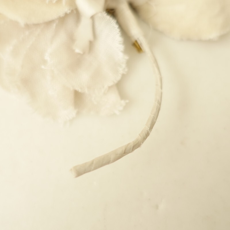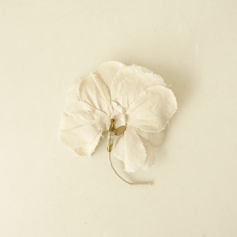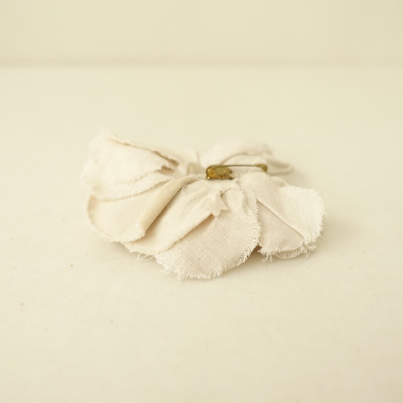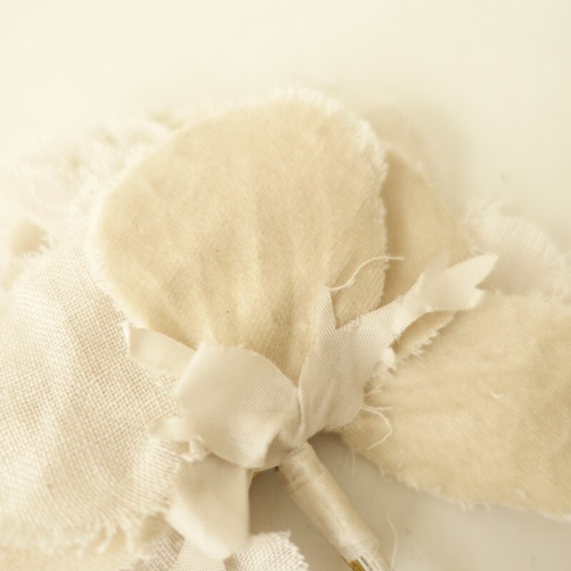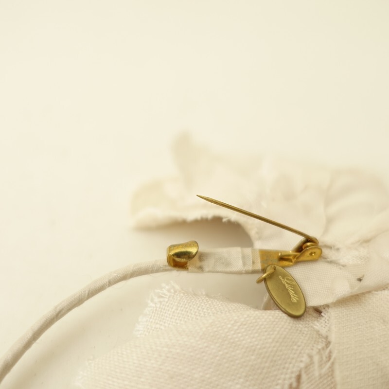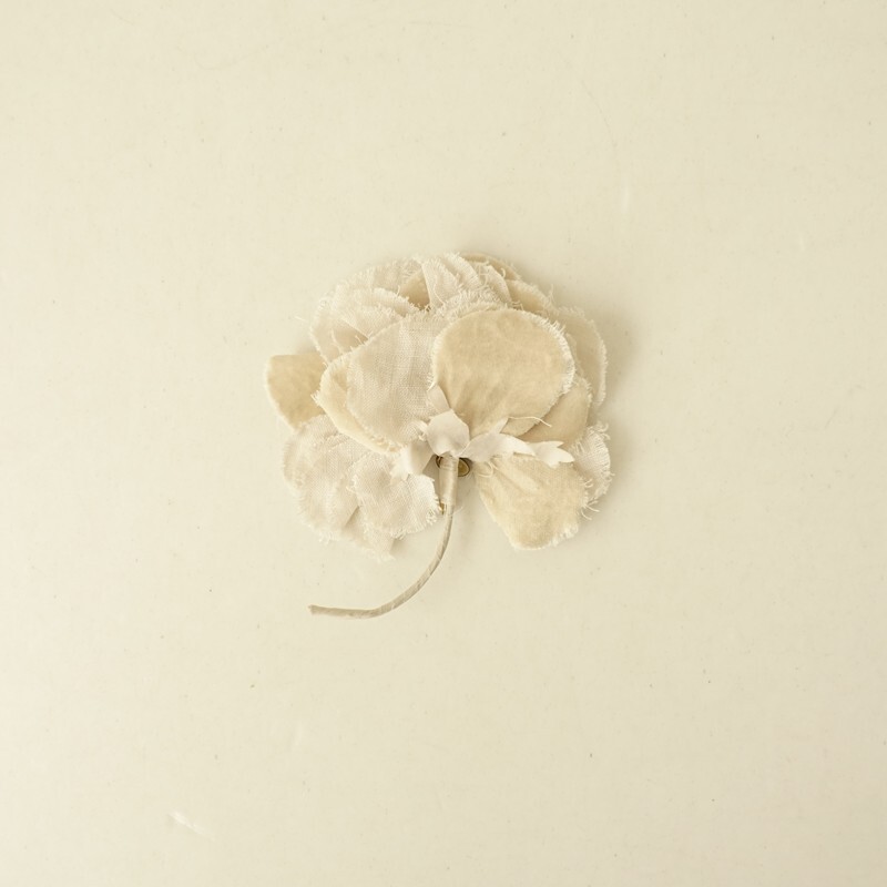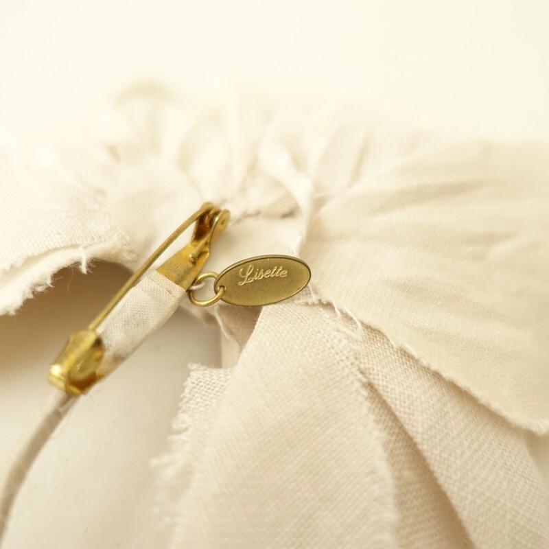 | Lisetteのコサージュです。カラーは、オフホワイトとライトベージュのやさしい色合いです。日常の装いになじむようにという想いをこめて、作らております。アンティークっぽい雰囲気です。 |