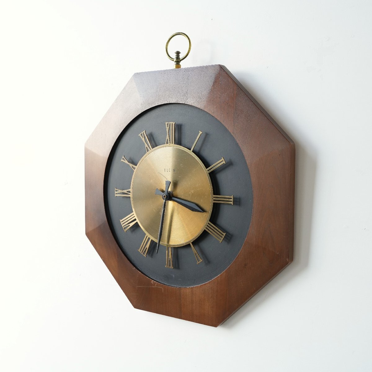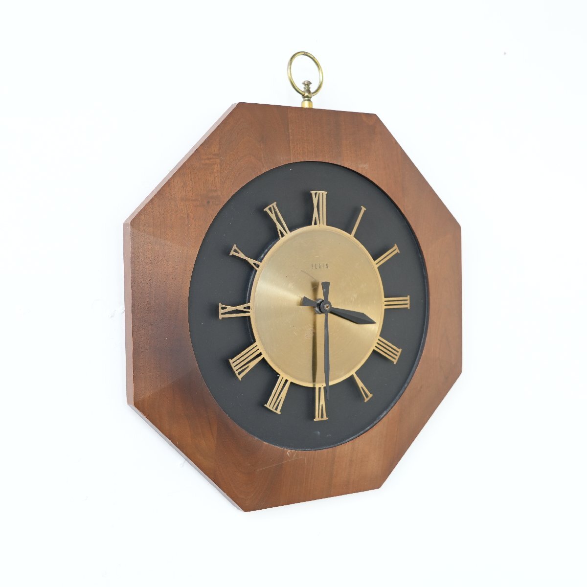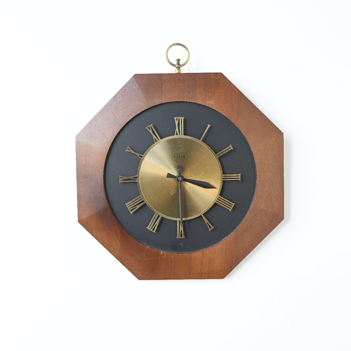 | 商品説明 explanation | 推定1970年代頃のアメリカの時計メーカー【ELGIN/エルジン】社の壁掛け時計です。 ウッド×ブラックの八角形フレームに、真鍮の文字盤が引き立つデザインです。 ミッドセンチュリーらしいデザインで飾るだけで雰囲気が出ます。 針はオリジナルです。カチカチと音がしないスイープクオーツの乾電池式ムーブメントに交換していますので、時間はほぼ正確です。 |