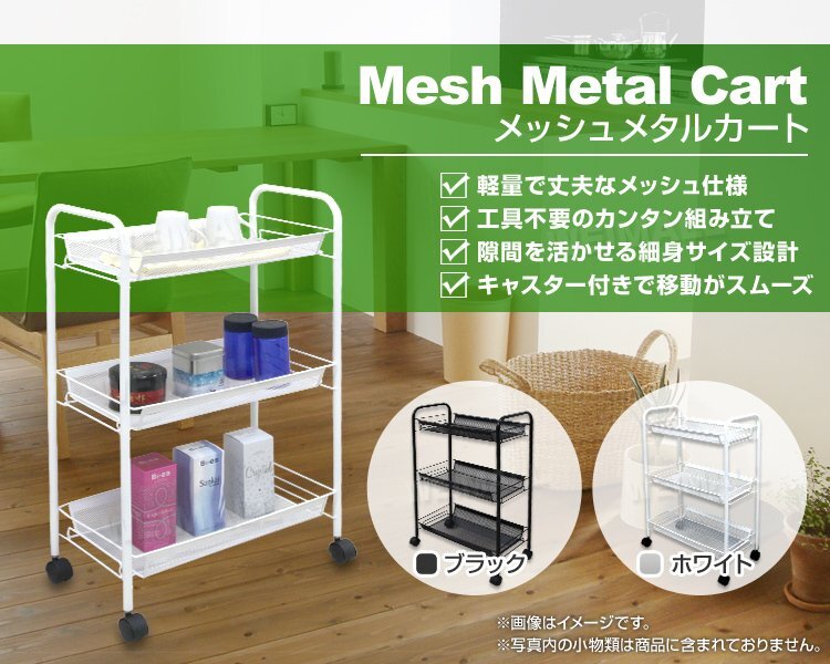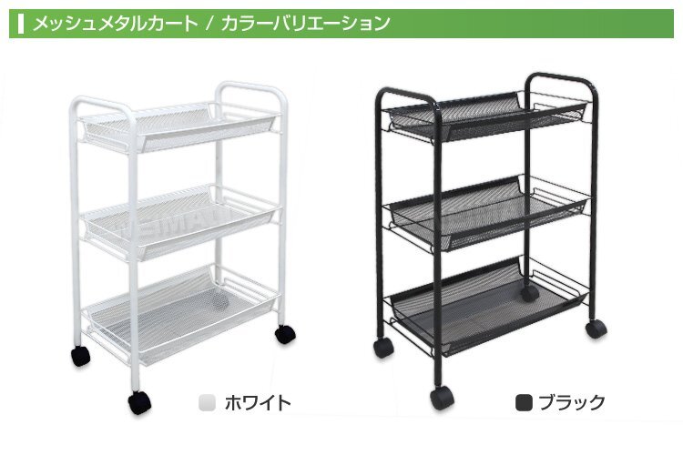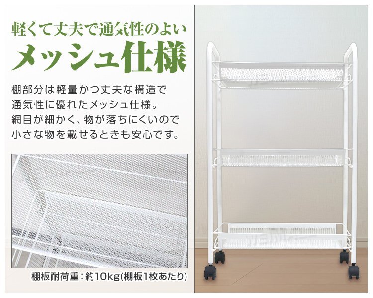 収納スペースの少ない場所で有効活用できるメッシュカートです。 キッチンで保存食品、雑貨・小物などを収納したり、サニタリーでタオルや洗剤等を収納したり、様々なシーンで使用できます。 スリムなカートですので、ちょっとした隙間の活用に便利です。 工具不要で簡単に組立てられます。 移動に便利なキャスター付き。 【商品仕様】 カラー:ホワイト 商品サイズ(約):幅26×奥行48.5×高さ77.5cm トレー内寸(約):幅22×奥行40.5×高さ28cm 重量(約):2.9kg 材質:スチール他 耐荷重(約):棚板1枚あたり 10kg、全体 30kg |