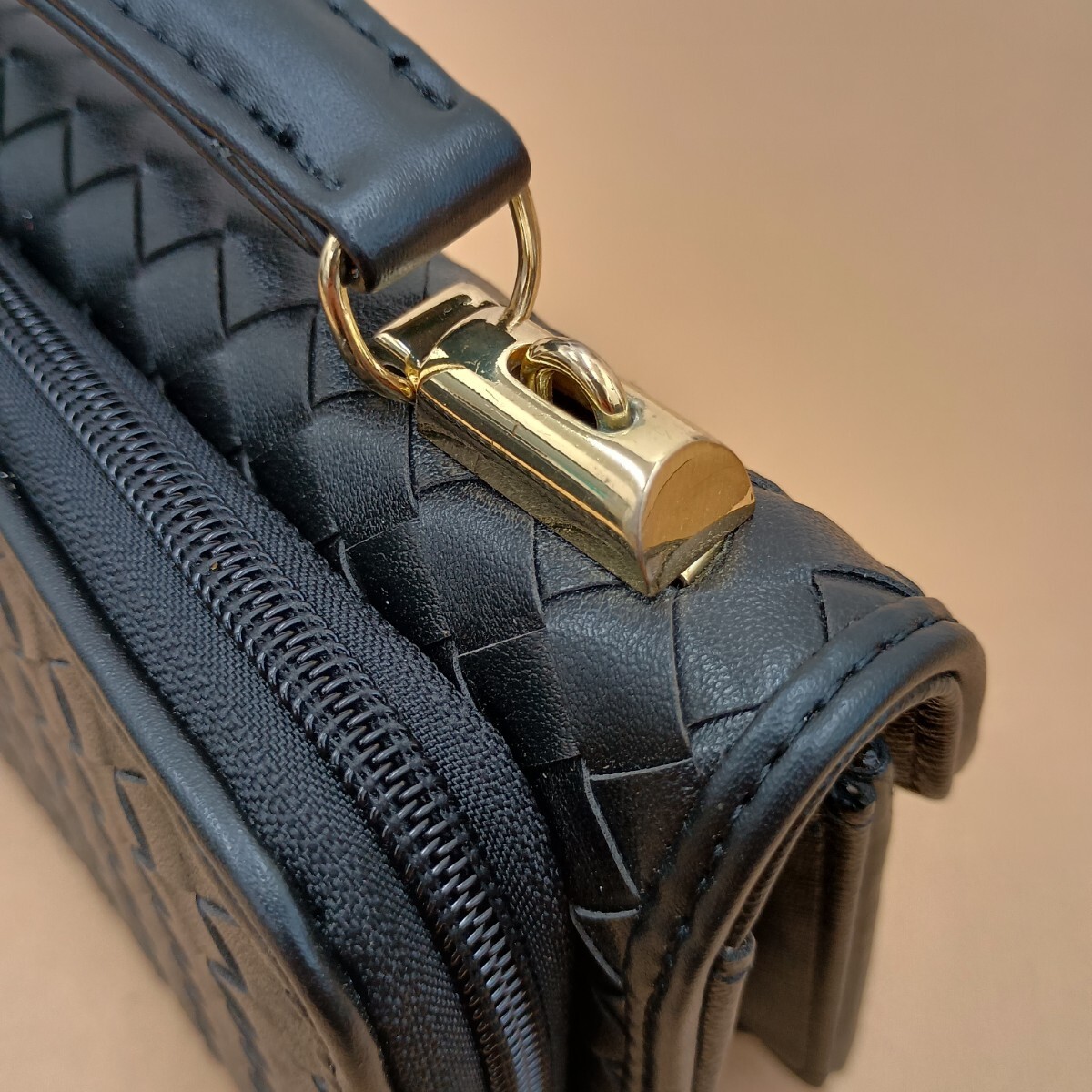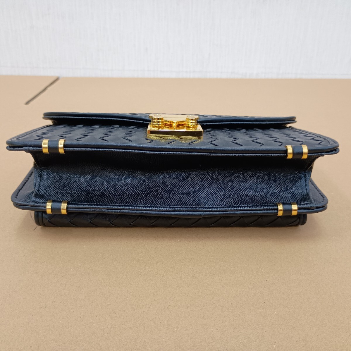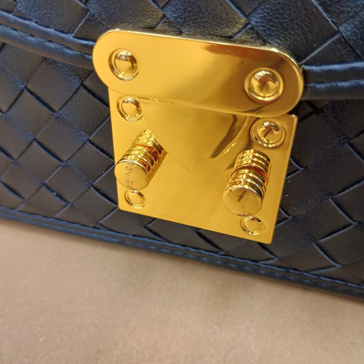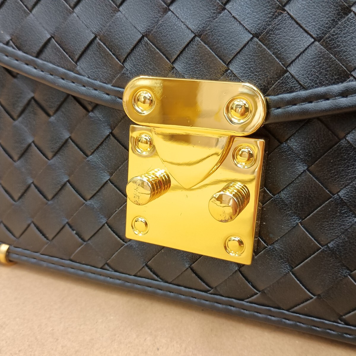バッグ本体はPUレザーを1枚1枚編み込んでありゴールドの金具と相まって高級感ある見た目となっております。