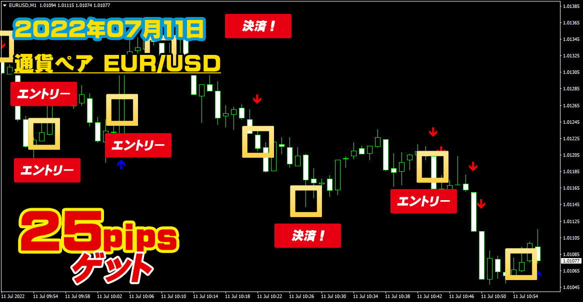 1分足でのエントリーと決済を示したチャートです。1回に1~5pips程度の利益を積み重ねた合計の獲得pipsです。