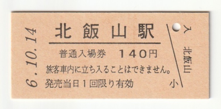 平成6年10月14日 飯山線 北飯山駅 140円硬券普通入場券(日付印刷)