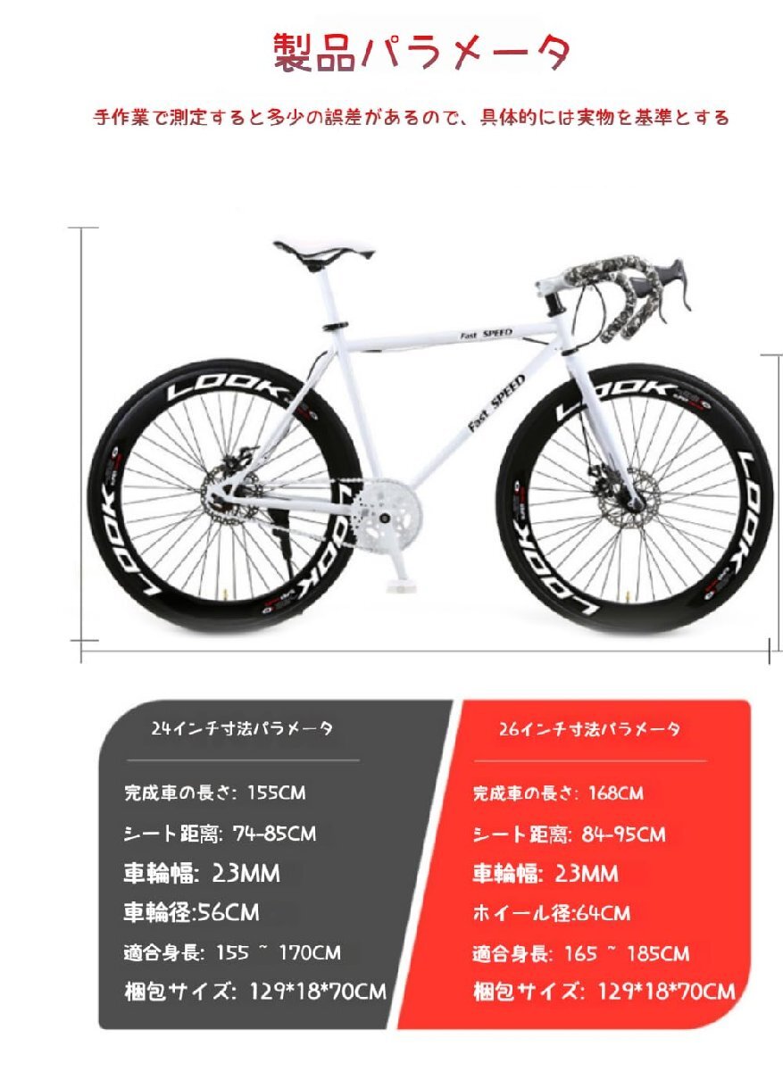 商品の説明自転車は独自の空力設計を採用しており、より実用的で細部まで快適な乗り心地を提供します 自転車用ハンドルバー:ホーンハンドル付きの模造カーボンファイバーで、長距離走行時の汗をよりよく吸収します 自転車フロントディレイラー:正確な位置決め、高硬度、シフト中の高速操作 自転車リアディレイラー:シフトリアディレイラー、簡単なシフト、そしてより楽なライディング ロードバイクタルン:8つのポジショニングタワーホイール、チェーンに均等なストレスがかかり、チェーンの落下が減少します ロードバイクホイール:40ナイフアルミニウム合金スチールリム 重量:2.85 kg 仕様:133 * 17.5 * 70cm 車輪:40ナイフ/60ナイフ 総重量:16kg ロードバイクギフト:自転車ベル、ロードバイク設置ツール、ポンプ、フットサポート、ボトルケージ、カーロック、前輪と後輪のライト、自転車の反射板