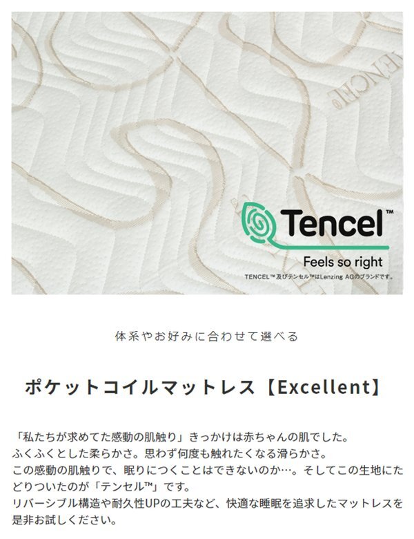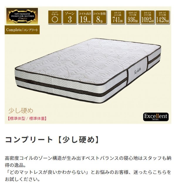 ※現在ご覧の商品ページはダブルのご購入ページとなります。 ヤフオクの仕様上単一ページに複数バリエーションを掲載することができませんので、他バリエーションが希望の場合は別ページでご購入お願い致します。 コットンに比べると2倍以上湿気を吸収することができる植物由来の繊維「テンセル」を使用した エクセレントシリーズ。 高密度コイルのゾーン構造が生み出す『コンプリート』は少し硬めの寝心地です。 リバーシブル素材で年中快適にご使用いただけます。 配達業者を指定いただくことはできません。 北海道/沖縄/離島のお届けに別途中継料金が発生します。 ※別途送料が発生する場合は後ほどご連絡させていただきます。 当店は正規店です。 タイミングによっては在庫切れの場合があります。