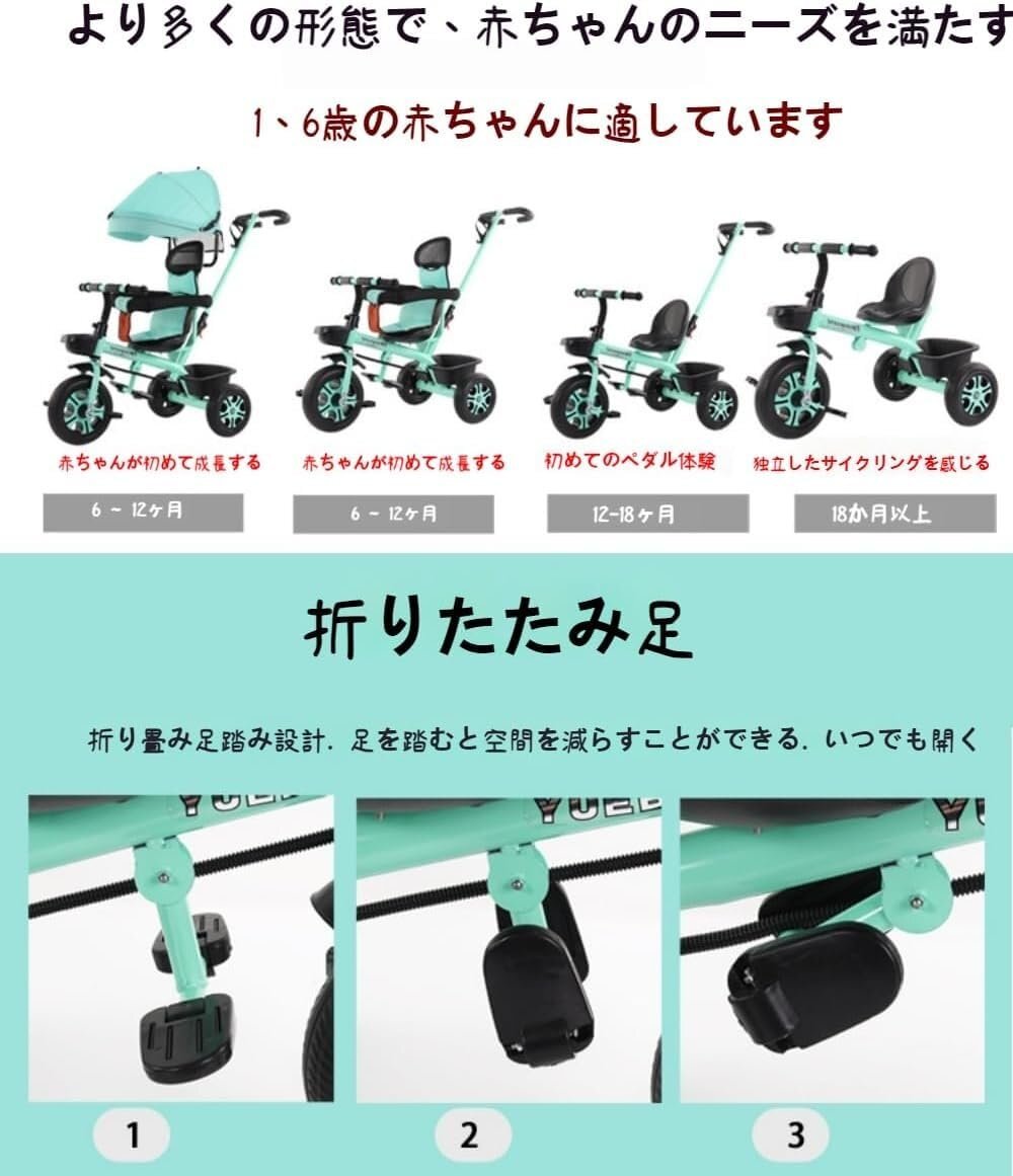 【4-in-1三輪車】6か月から5歳までのお子様に適しています。このベビーカーは、幼児用ベビーカー、親のステアリング三輪車、乗り方を学ぶ三輪車、クラシック三輪車として、さまざまな段階の子供に合わせて使用できます。 。 お子様の身長に合わせてキャノピー、ガードレール、後部プッシュロッドを分解できます。