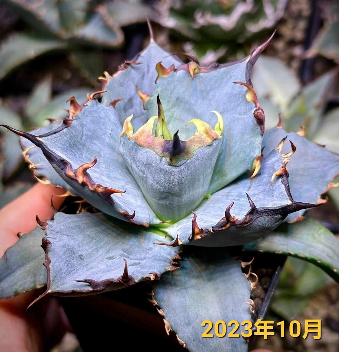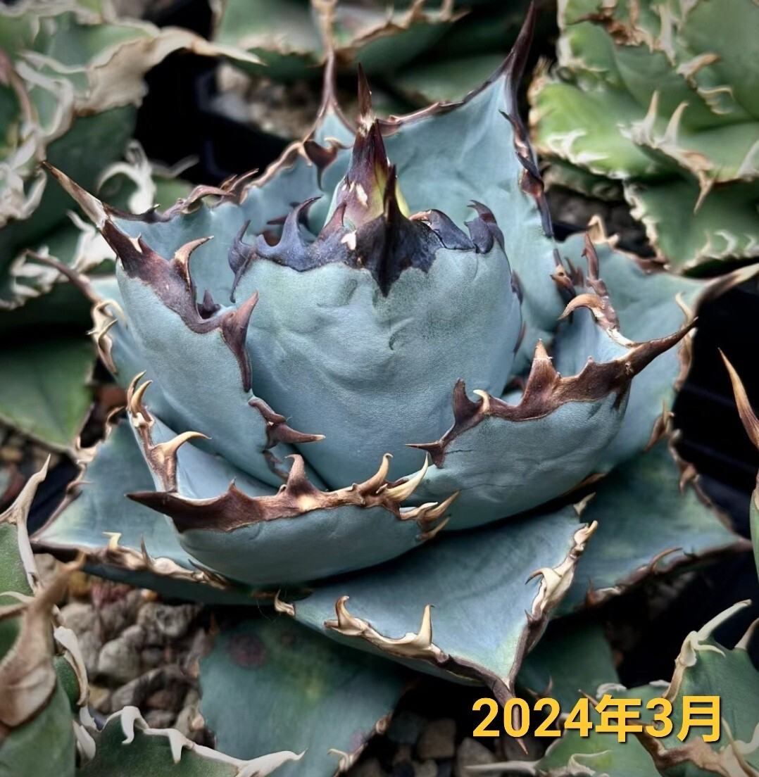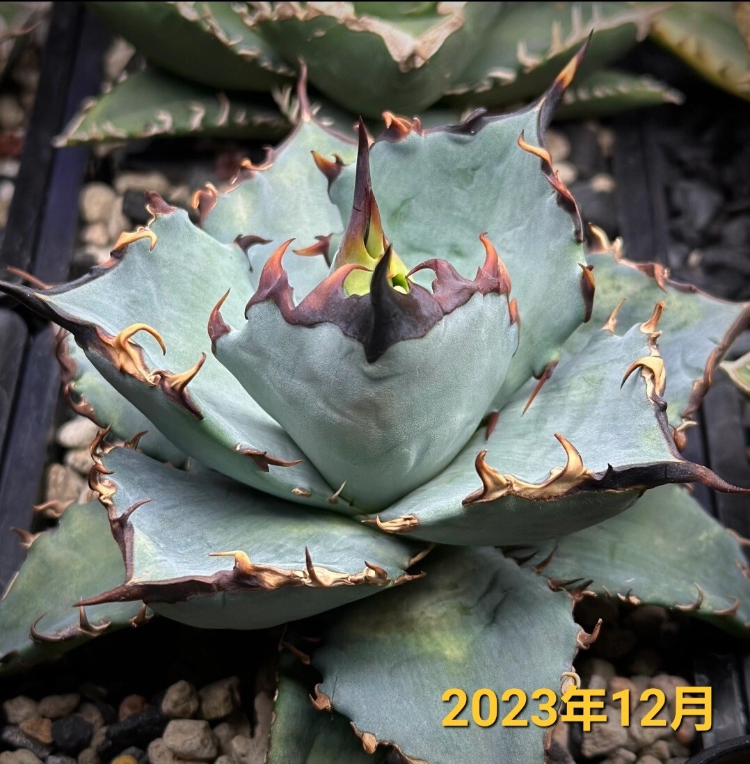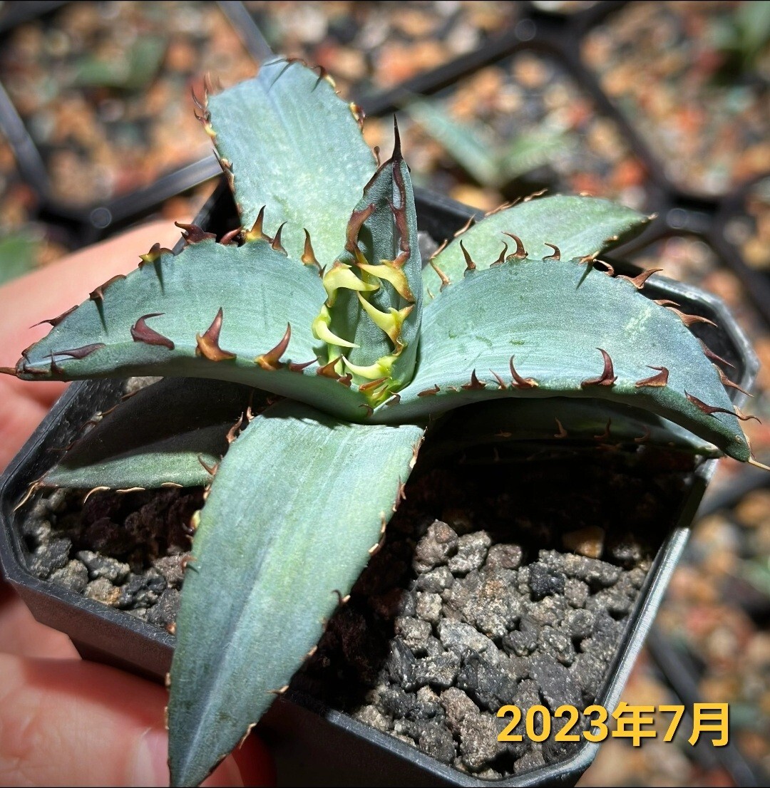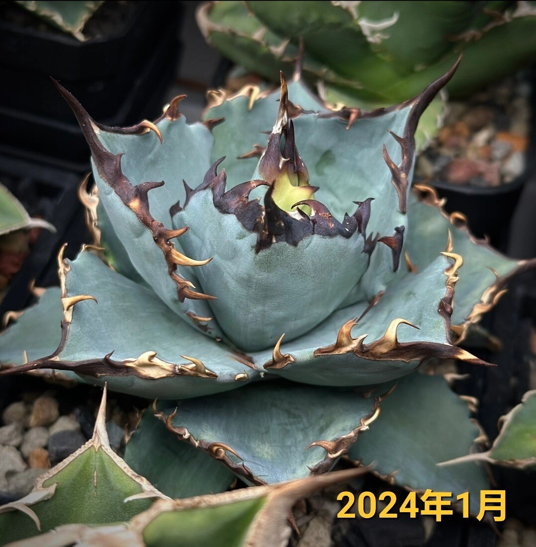 写真は育成された個体の参考例です。葉は青みがかった美しい色合いと鋭い黒いトゲが特徴的で、独特の存在感を放つ希少な品種です。耐寒性が高く、管理が比較的簡単なため、初心者から上級者まで幅広い方におすすめです。