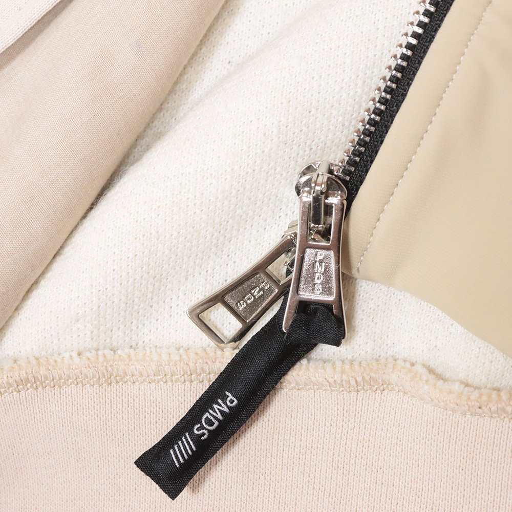 背中にはPMDSらしい存在感のある刺繍ロゴが施され、シンプルな佇まいの中にブランドらしい遊び心を表現。ダブルジップ仕様のフロントや立体的なフード、両サイドのポケットなど、日常使いを意識した機能性も備えています。ややゆとりを持たせたシルエットは、一枚で着てもアウターのインナーとしてもバランスよく、都会的なストリートスタイルに自然に馴染みます。軽さと暖かさ、そして印象的なデザインを兼ね備えたこの一着は、冬のカジュアルスタイルに差をつけたい大人のワードローブにふさわしいアイテムです。