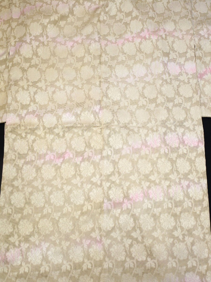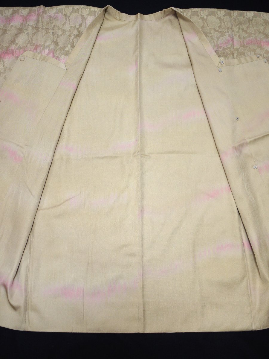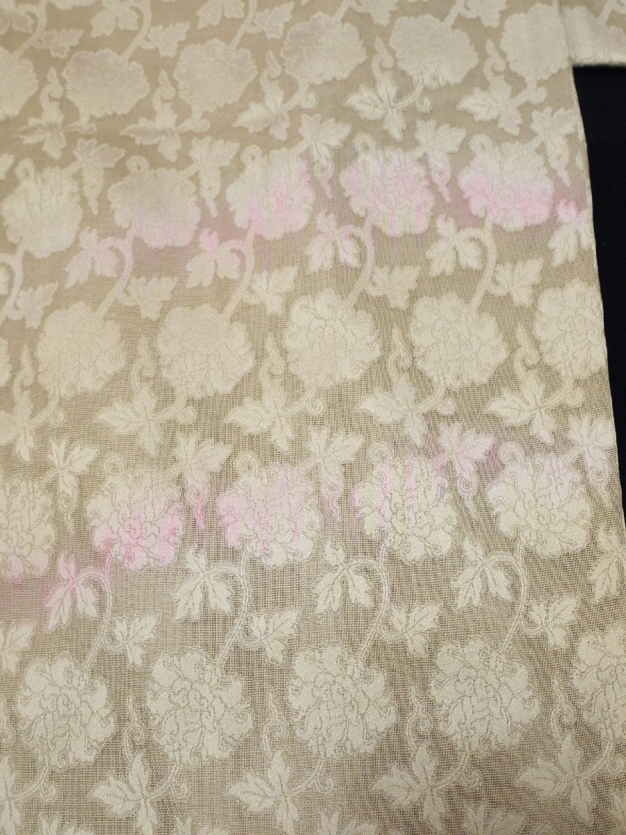 | 商品名 | 道行【能州紬・絲藝苑】リバーシブル 牡丹唐草紋紗×能州織 薄ベージュ地 ピンク暈し・95㎝ 未着用 |
