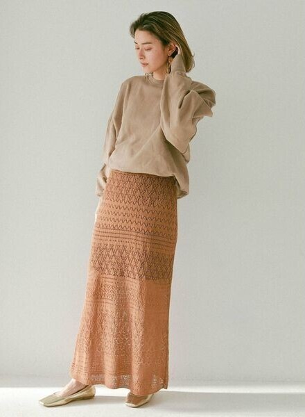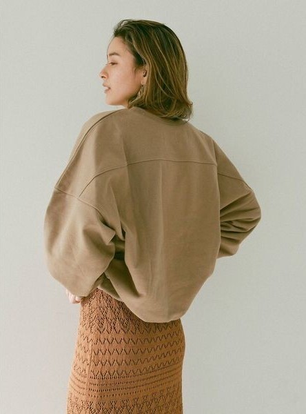 タックパンツとのスタイリングがオススメです。インナーにカットソーをレイヤードし、袖から少し見せるとお洒落見えします。スカートとの着合わせもバランスが良く、中でもフィットフレア型は女性らしい印象ですがルーズなスウェットと合わせることでカジュアルミックスでバランスの取れたスタイリングになります。