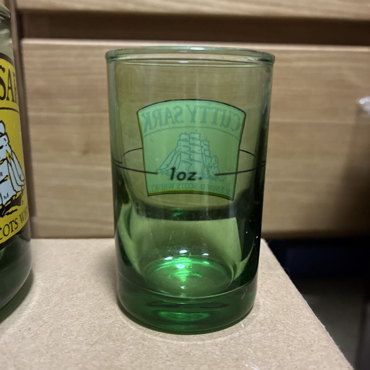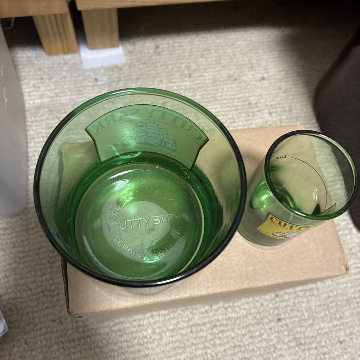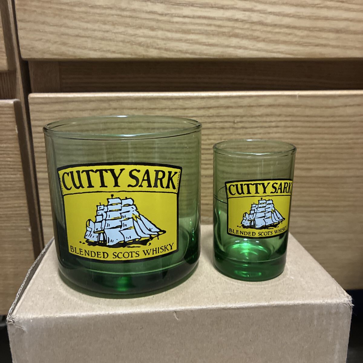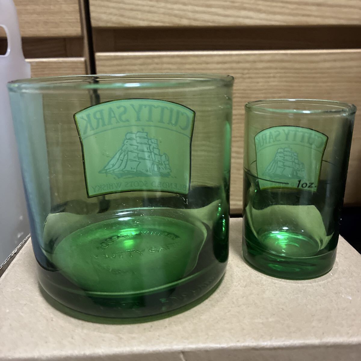 ご存知、スコッチウイスキーのブランド「カティーサーク」のボトルと同じグリーングラスで作られたロックグラスと目盛のあるショットグラスのセット未使用保管品です。カティーがお好きな方、お酒小物コレクションされている方いかがでしょうか。