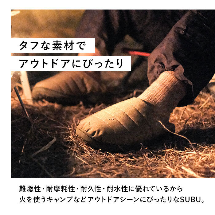 | 商品説明 | ・・【“SUBU”・・誰も知らない冬のサンダル】 ・寒い時期、ふと出掛ける時に素足で履ける、今までにない秋冬サンダル「SUBU NANNEN -ナンネン-」 ・【ダウンのような暖かさで足元包む】 ・ダウンジャケットのようなキルティング素材で足元をふんわり包み、冷え込む朝も暖かな履き心地。 ・【素足のままでも至福の心地よさ】 ・内側の生地をベルベット調の滑らかな起毛素材で仕上げ、素足が包み込まれるような心地よさ。 ・【足裏に優しい4層構造ソール】 ・4層構造のフッドベッドが着地時の衝撃をふわっと吸収。抜群のフィット感と優しい履き心地が魅力。 ・【スリッパみたいにサッと履ける】 ・大きく開いた履き口と踵部分が低めになったフラット形状で、つま先がスルッと入り着脱スムーズ。 ・【焚き火を囲むキャンプシーンに】 ・・「SUBU -NANNEN-」は難燃性に優れたCORDURA 305Dを生地に使用し、火を使うキャンプに最適。テントの出入り時の脱ぎ履きも手間取らない! ・※CORDURA(R)FABRICとは、摩耗、耐久性、耐水性に優れた繊維であり、ミリタリーやワークウェアにも使用されるファブリックブランドです ・【滑りにくいアウトソール】 ・合成ゴム製のアウトソールにはしっかりと厚みを持たせ、地面からの冷えを感じにくいつくり。底面の滑り止めの凹凸には、SUBUのロゴをさりげなく刻印。 ・【ちょっとそこまでのお出掛けに】 ・ご近所へのお買い物やワンちゃんのお散歩に気軽に履ける!寒い季節でも素足のままで足元快適。 ・【ルームシューズとしても大活躍】 ・クッション性のあるインソールはリラックスして過ごすおうち時間にも最適。オフィスサンダルにも◎ ・【大切な人とリンクコーデも自在】 ・カップルやファミリーでコーディネートできる22cm~29.5cmまでの全4サイズ展開。 ・【アウトドアに身軽に持ち運び】 ・開口部を止水ファスナーで仕上げたCORDURA生地の収納袋は、肩掛けしやすいショルダーベルト付。ほのかに浮かびあがるロゴデザイン入りで、ギフトにも最適。 |