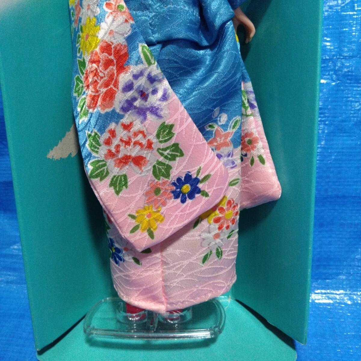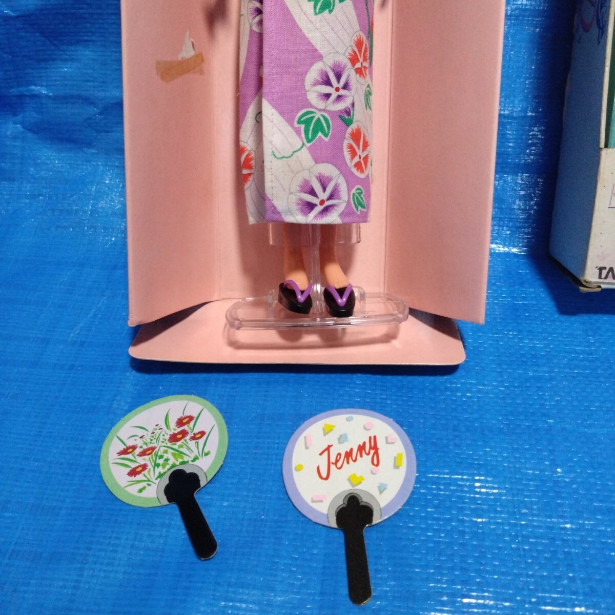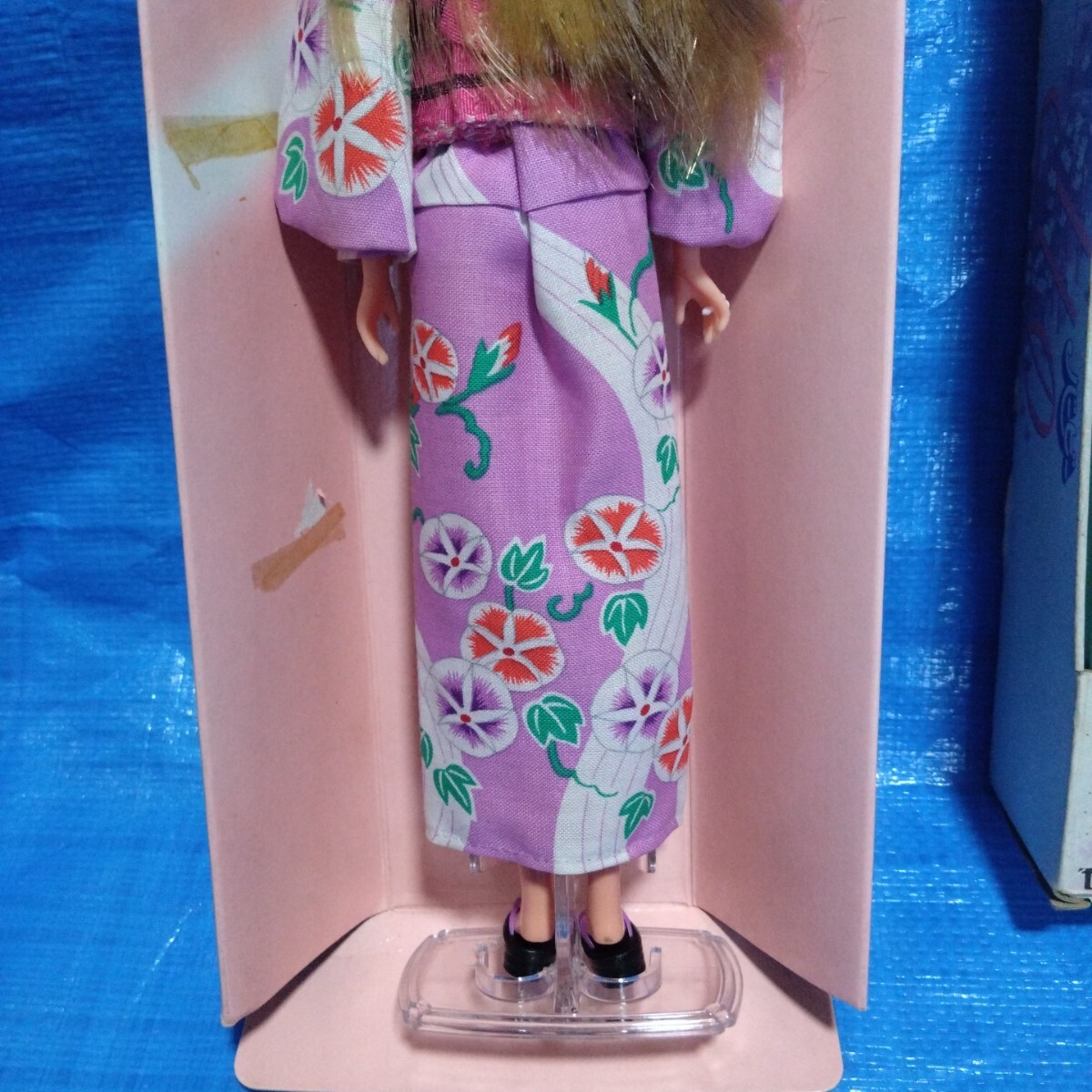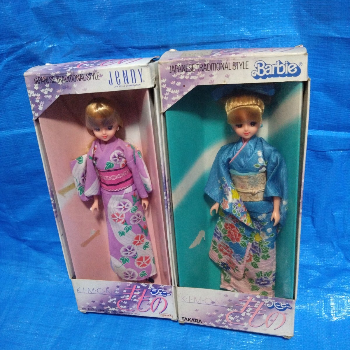 どちらも未使用に近く、浴衣は台紙から外したのみで、きものの子は、別のタカラバービーのきものを着せ替えた記憶です。多少使用感あるきものですが、大きな傷みや難はありません。リポンは市販のリボンで作ったものでデフォルトでは無いです。箱はどちらもかなり傷み、破損、汚れがあります。