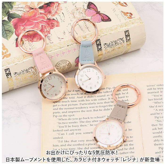 | 商品説明 | ・・お出かけにぴったりな5気圧防水!日本製ムーブメントを使用した、カラビナ付きウォッチ「レジナ」が新登場。 ・【日常生活防水タイプ】 ・うれしい5気圧防水(日常生活防水)仕様。洗顔時・小雨などに一時的に濡れる程度なら大丈夫♪(※プールや海でのご使用は故障の原因となるため、お控えください。) ・【シンプルな文字盤】 ・時刻を確認しやすい文字盤デザイン。文字盤ケース横のつまみで、簡単に時刻調節が可能。 ・【アクセントをプラス】 ・合皮バンドの型押しデザインが、さりげないアクセントに。 ・【便利なカラビナ付き】 ・バッグのハンドルやベルトループなどにサッと取り付けできる!腕時計の着用ができないお仕事にも最適。 ・【可愛らしいカラーバリエーション】 ・淡めのパステルカラーをラインナップ。女性らしい印象を演出。 |