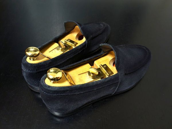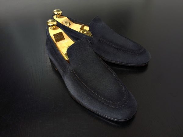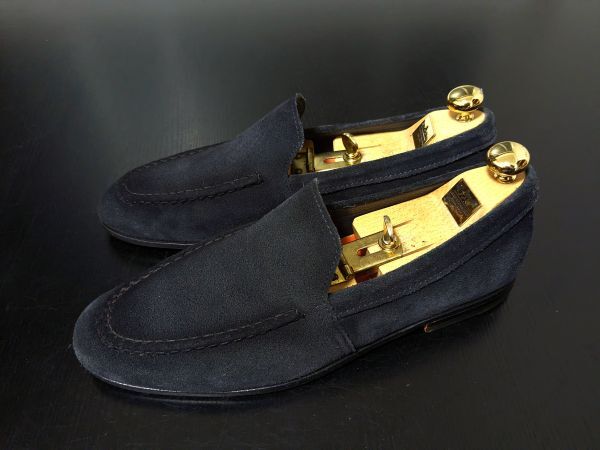 サントー二のシンプルな濃紺スエードソフトドレスローファー。