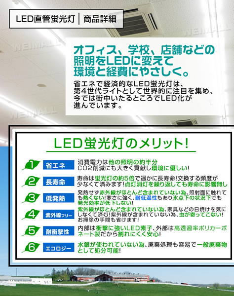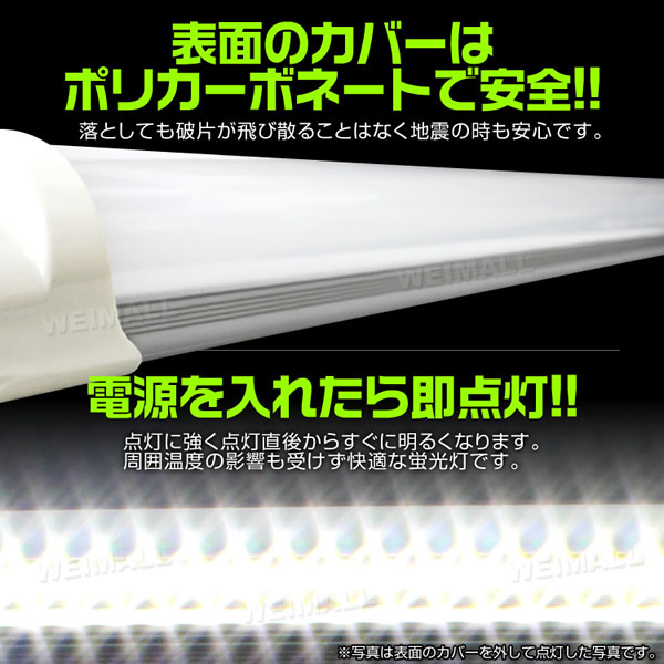 今までネックになっていた配線工事を必要としないタイプです。 ◇ラビットスターター式やグロー球スターター式の器具はそのままご使用できます。 (一般蛍光管と交換するだけで使用できます。ただし、ひとつの灯具に一般蛍光管や他のLED蛍光灯と混ぜて使用しないでください) ◇インバータ式、電子安定器、調光できる安定器を持つ灯具、他社LED蛍光灯などのために配線加工や改造をされた灯具は使用できません。 また取り付けないで下さい。無理に使用を続けると、動作異常となったり灯具や本製品が故障することがありまれに発煙、発火に至るおそれがあります。 アルミレール採用による優れた放熱効果性の高い最新LED蛍光灯です。 高性能高輝度LED(SMD)を使用!驚異的な明るさを実現!! 高放熱アルミケース・アルミ基板採用!! 高透過率ポリカーボネート製カバー採用!! 放熱効果を高めつつ長寿命を確保!! 従来のLED蛍光灯よりも明るい!! 省エネ&長寿命&超軽量!! SMD 独特の、この輝度を、是非、体感して下さい。 LED(SMD)蛍光灯へ取り換えるだけでCO2をおよそ50~80%削減! 落ちても割れにくい飛散防止効果が高い安全設計! 長寿命で球切れいらずの省電力! 低発熱でチラツキ、ノイズが少なく虫が寄りにくい光ですので暑い時期に最適です。 【商品仕様】 ①全長:1200mm ②蛍光部分長さ:1165mm ③太さ(プラスチック含む):31mm ④太さ(蛍光部分):28mm ⑤先部分楕円の大きさ(短い方):23mm ⑥先部分楕円の大きさ(長い方):28mm ⑦先部分楕円の横から見た長さ:8mm ⑧接続部分の金属の長さ:7mm ※写真と実物は多少異なる場合がございます。あらかじめご了承下さい。 【セット販売】 セット販売:1本・2本・10本・20本・50本・100本 |