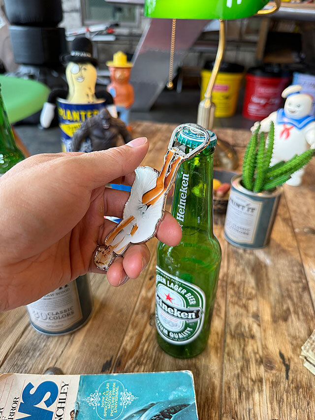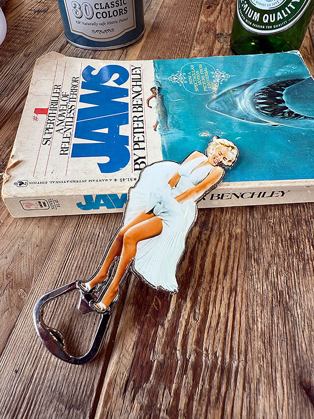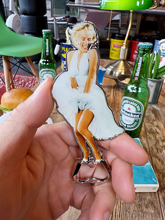 映画「七年目の浮気」でみせたスカートがフワッと舞いあがる姿をそのままデザインにした、メタル製のボトルオープナーです。
