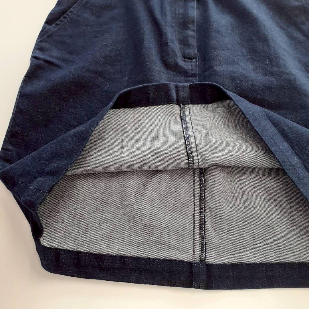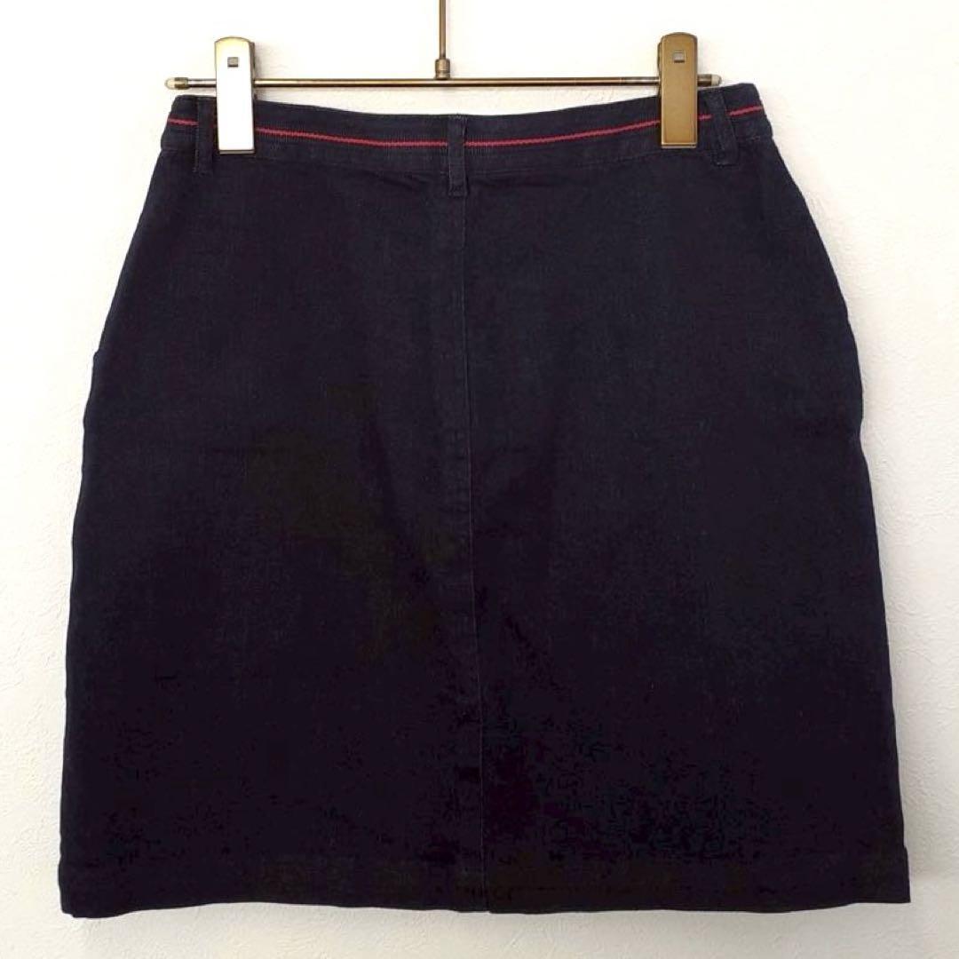 ネイビーのタイトスカート、ボタン付き、ストライプウエストバンド。