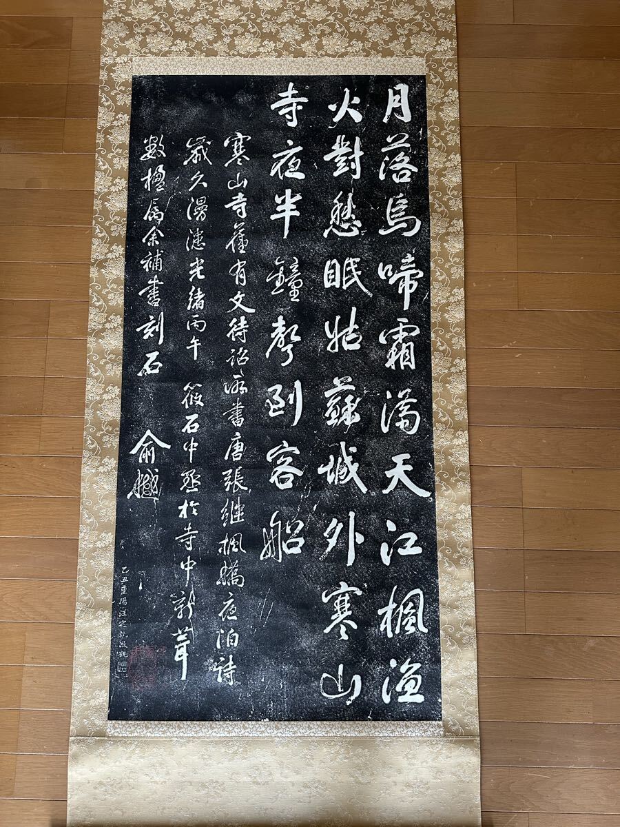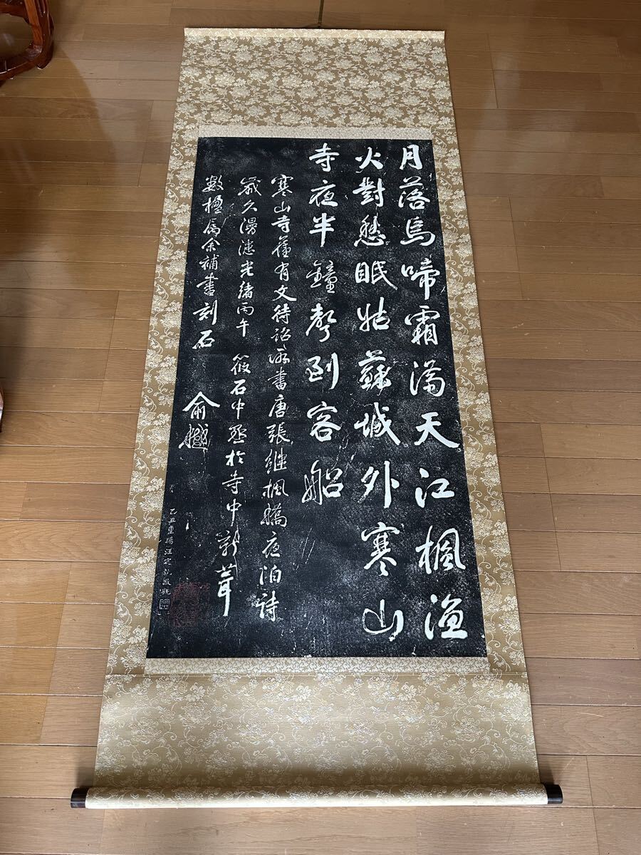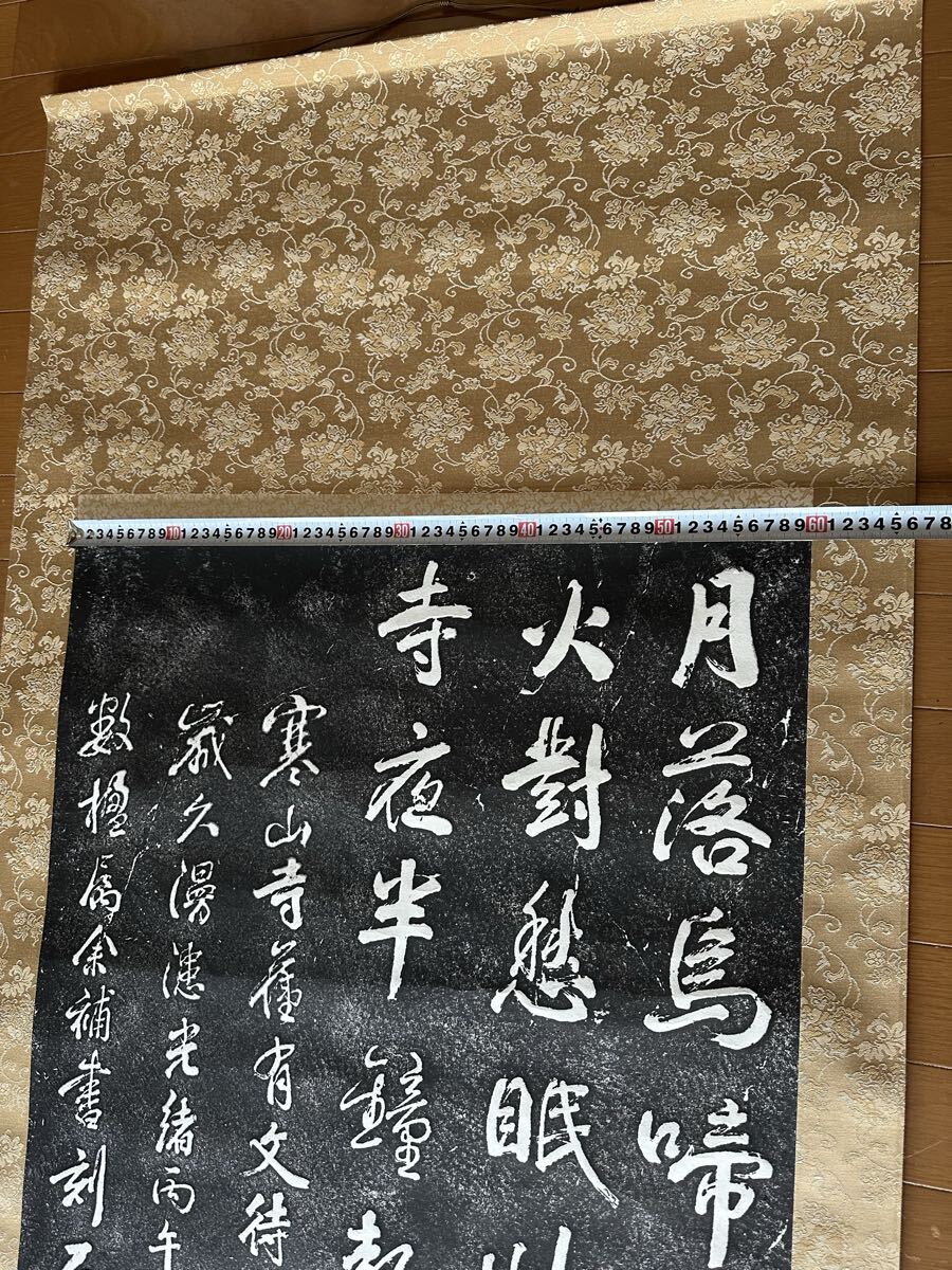 絹表装 紙本 掛軸 寒山寺楓橋夜泊詩 大幅 拓本 箱入り、状態が良く、黒檀画。