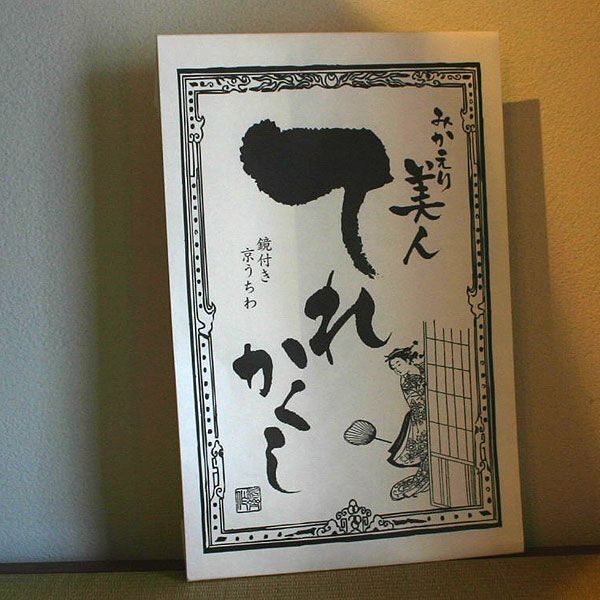 この京うちわは、扇いで涼を求める用途だけではなく、平安時代から高貴な人が風や光を防いだり、顔を隠して威厳を正す道具だった団扇を思い浮かべ、持ち手の部分に手鏡が付いており、平安時代の貴族道具のように、ふとお顔を隠したときに 手鏡で貴方のおしゃれ確認が出来る様になった趣向です。夏のお出かけの涼縁として お部屋の 飾りとして ぜひお供下さい。