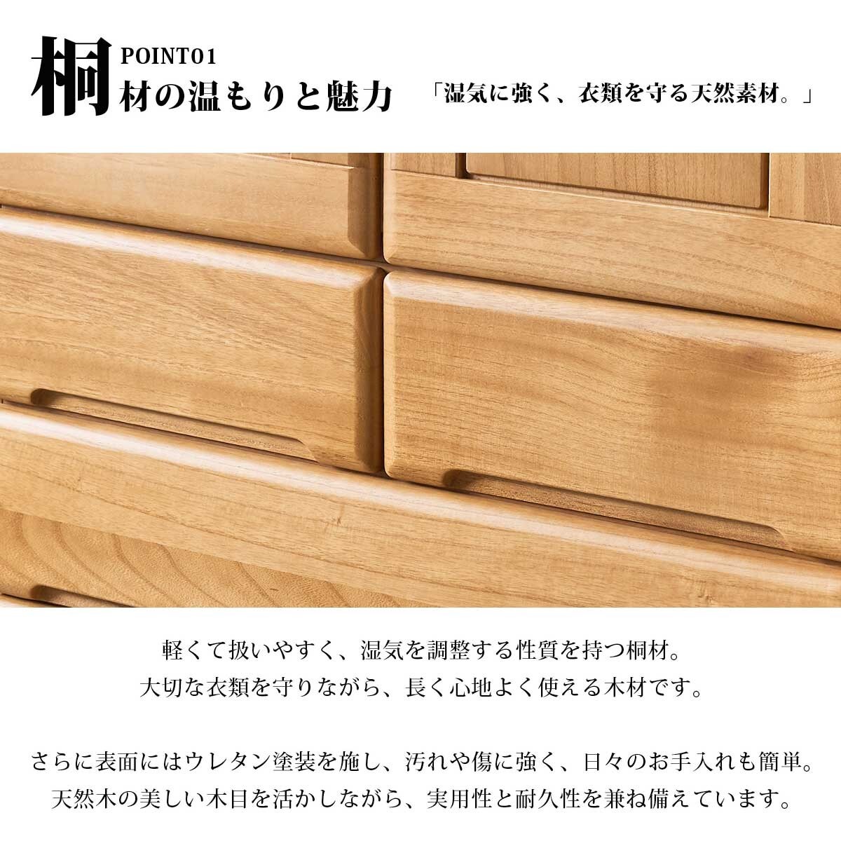 特  徴ナチュラル感あふれる桐無垢材を採用したモダンワードローブ。