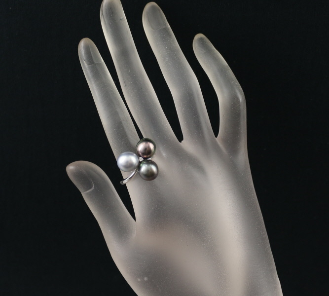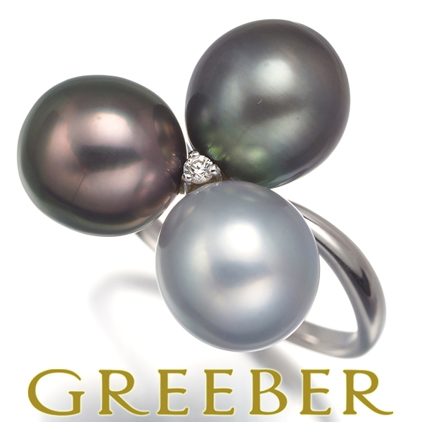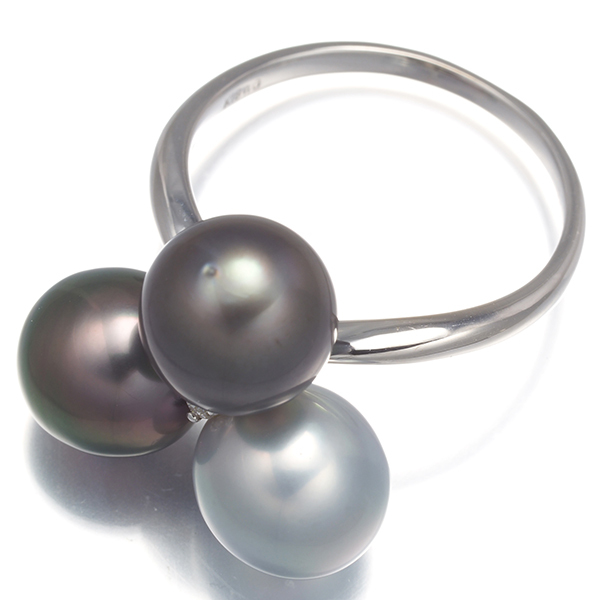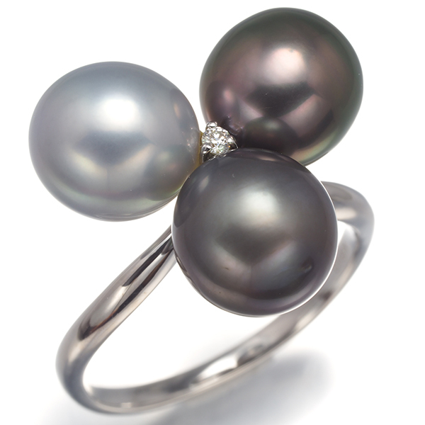 ニュアンス異なる3珠のブラックパールを飾ったリング。上質な肌艶を持ち美しい光沢を披露するパール達の中央に上質メレダイヤの輝きを添えておりますよ。 |
