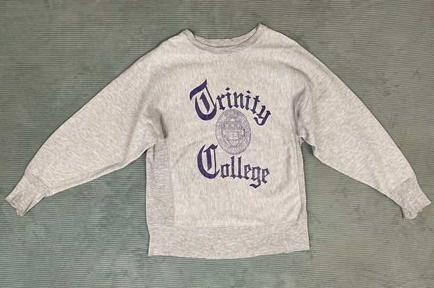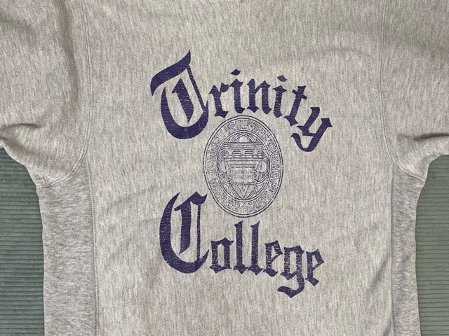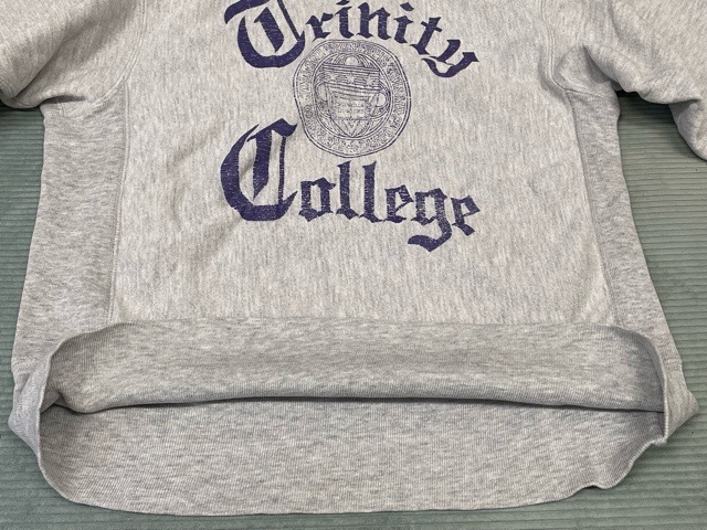 説明 | スウェットの定番チャンピオン・リバースウィーブ トリニティ・カレッジ オールドイングリッシュフォントTrinity College 3段ラバープリント ボロいですがビンテージリバースウィーブの雰囲気のある個体です 80年代 アメリカ製 トリコタグ |