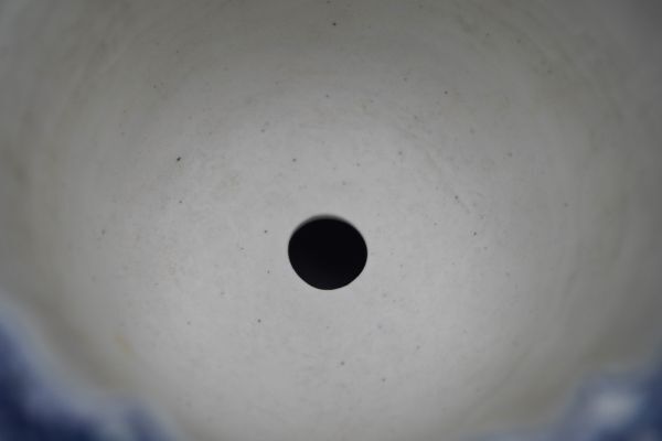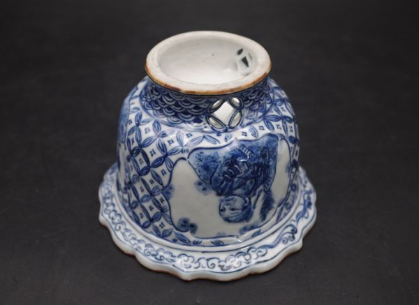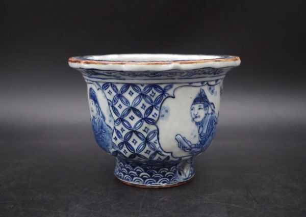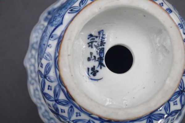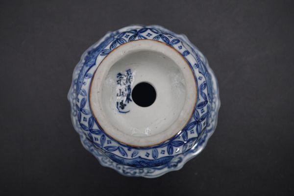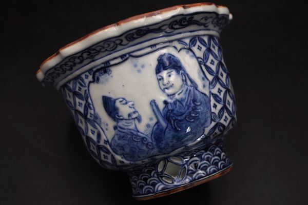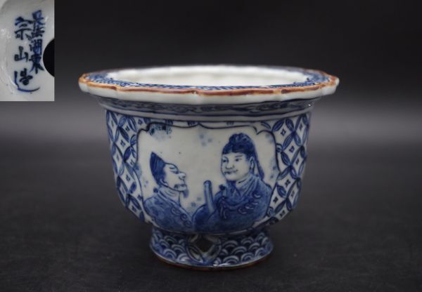 コレクター買取品 長浜湖東焼 奥村宗山造 人物染付七宝紋透かし古鏡形鉢 植木鉢 盆栽鉢H199