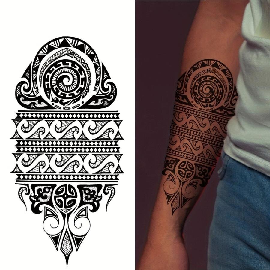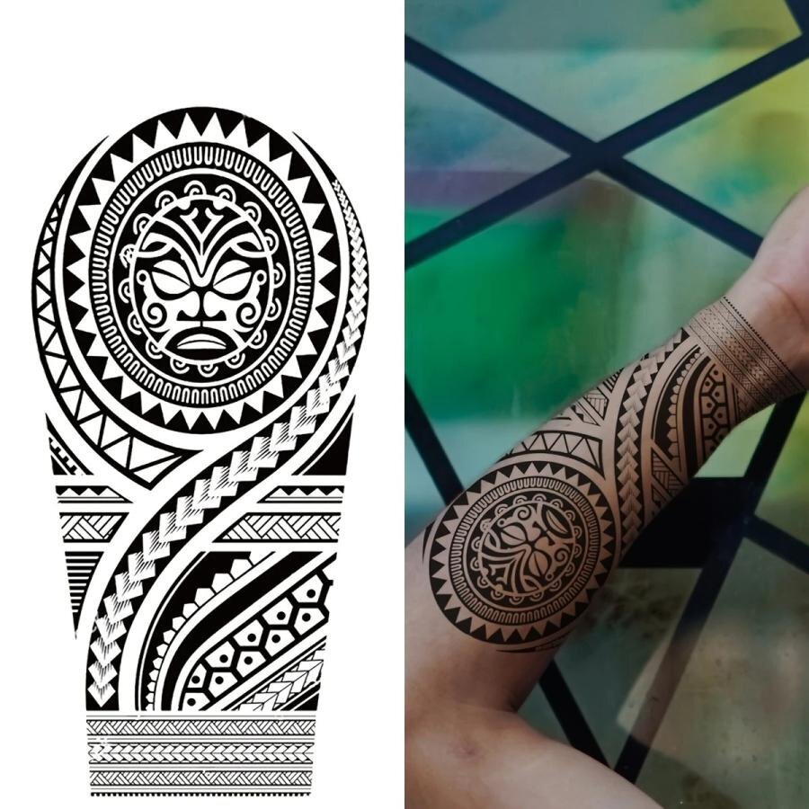 | 台紙サイズ 18.9cm×9.5cm 肘から手首ほどのサイズのタトゥーシールです。 ※敏感肌、目の近く、または接着剤にアレルギーがある場合は使用しないでください。 【使用方法】 ●透明フィルムを剥がし、スプレーまたは濡れタオルでステッカーをしっかりと濡らして下さい。 ●10秒間、肌に密着させ、ステッカーを剥がします。その後約2時間濡らさないで下さい。 ●約、6時間後に発色開始→約24~48時間程度で完全発色します。 ●約1~2週間持続します。 【貼る時のコツ】 シートそのままの大きさだと曲げ辛く密着しにくい為、余白部分を切ってから貼るのがコツです。 ※商品画像の色味は画面でみた場合と実際は多少の色差が生じる場合がございます。 ※海外製品のため入荷時点でしわや折れ目が付いている場合がございますが、ご使用には問題ございませんので予めご了承ください。
