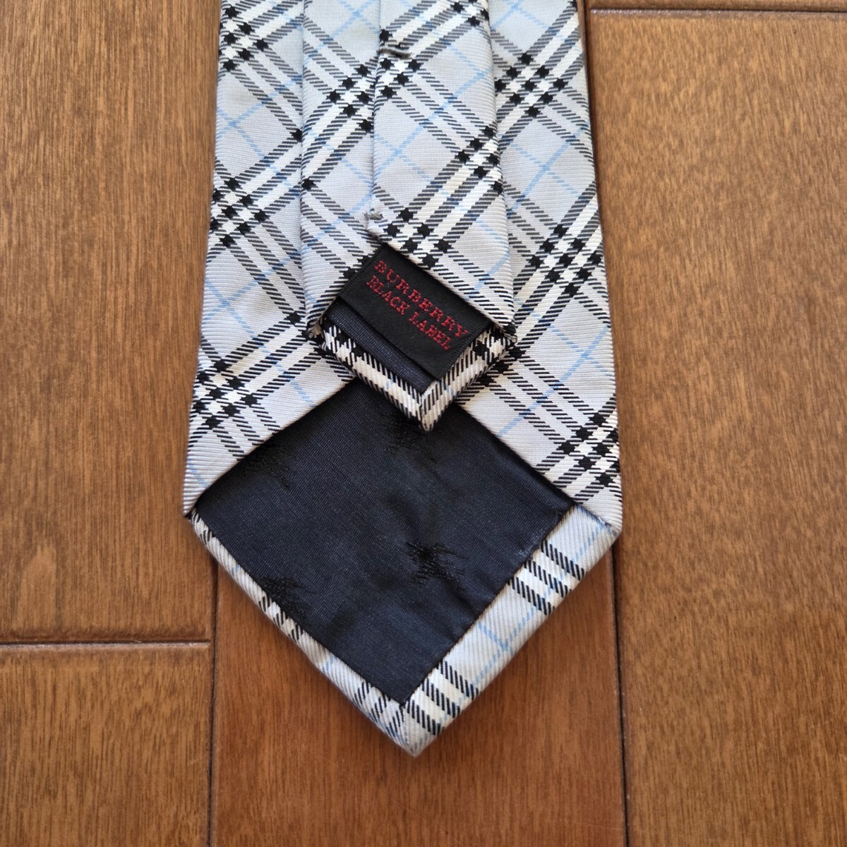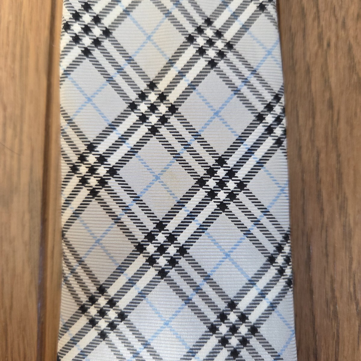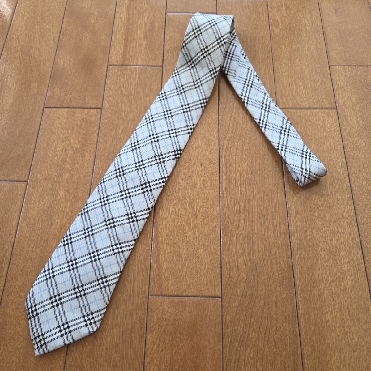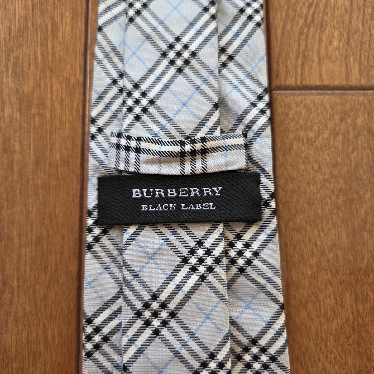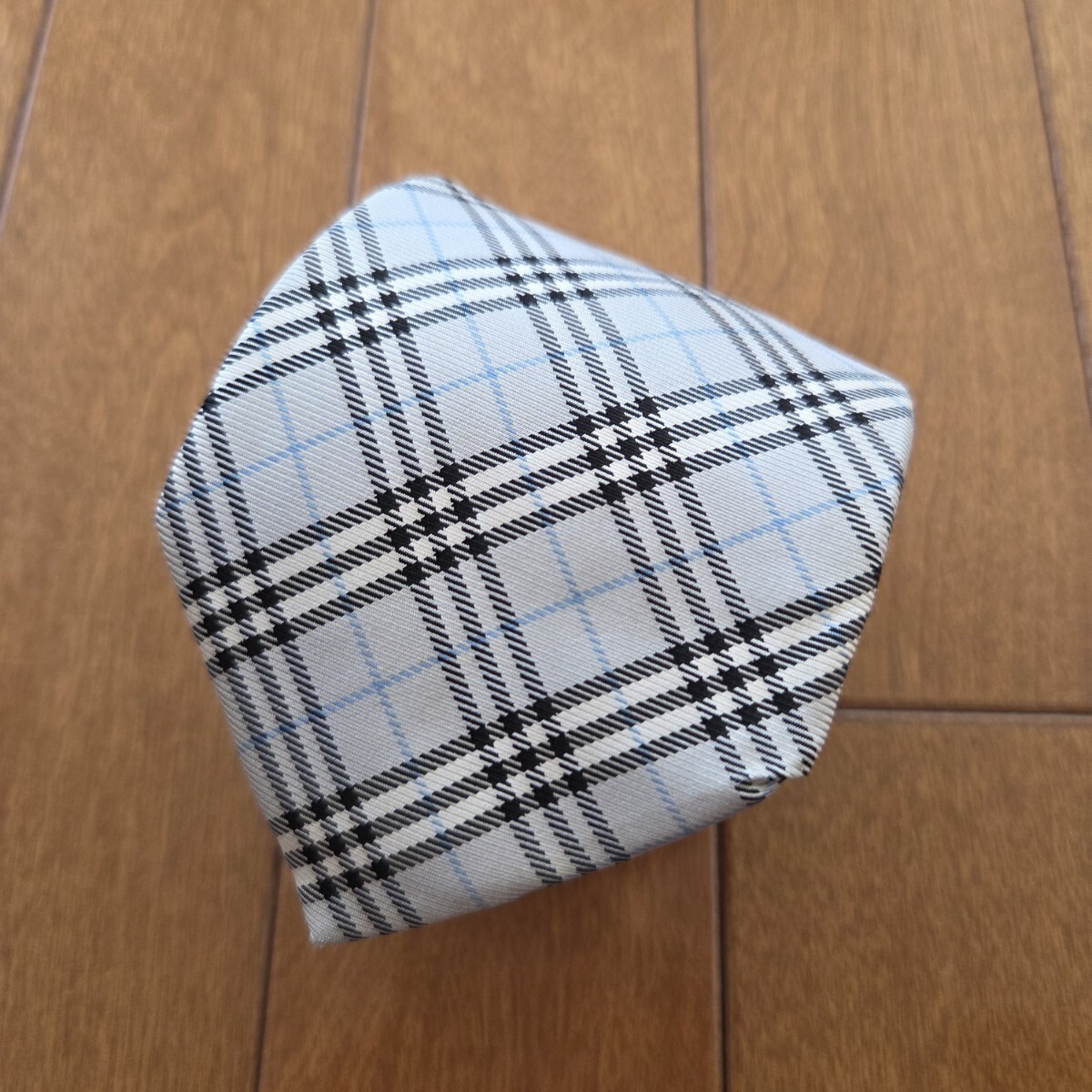 バーバリーブラックレーベルの、ブルーグレー×ブルー×ブラック×ホワイトのチェック柄のネクタイです。