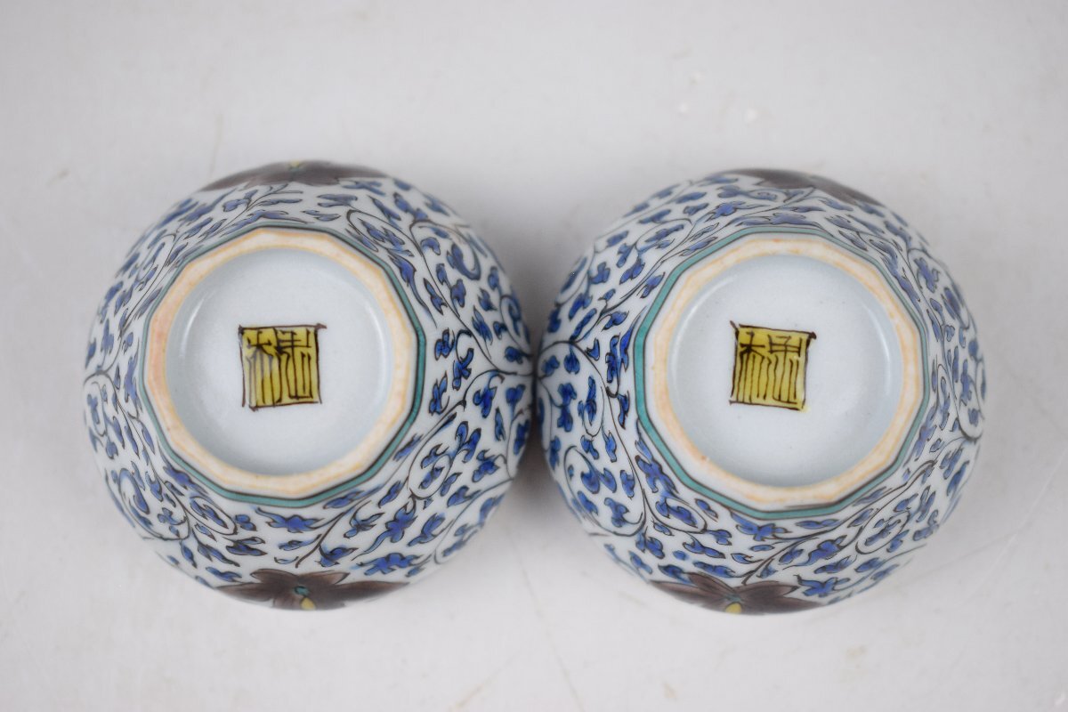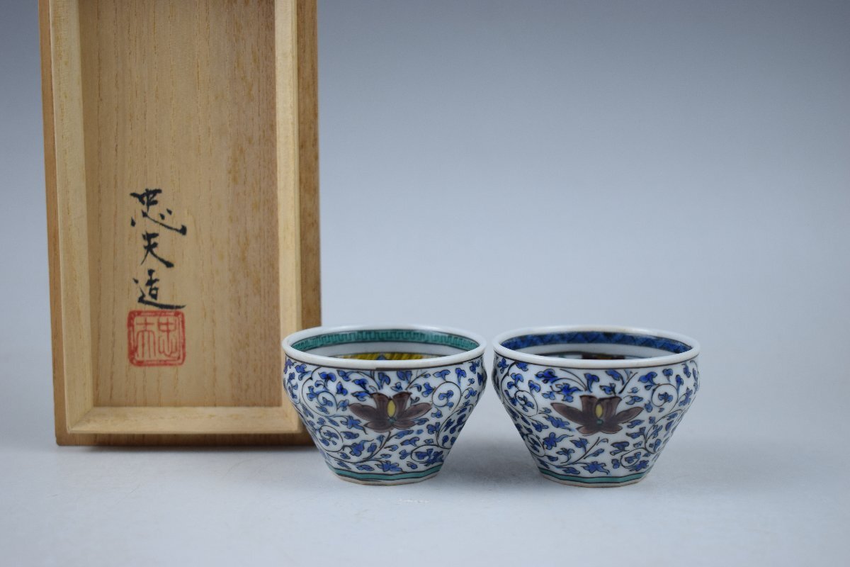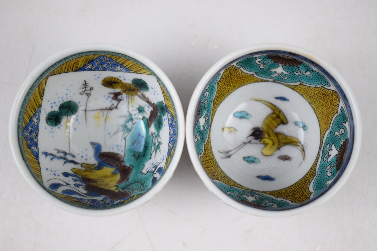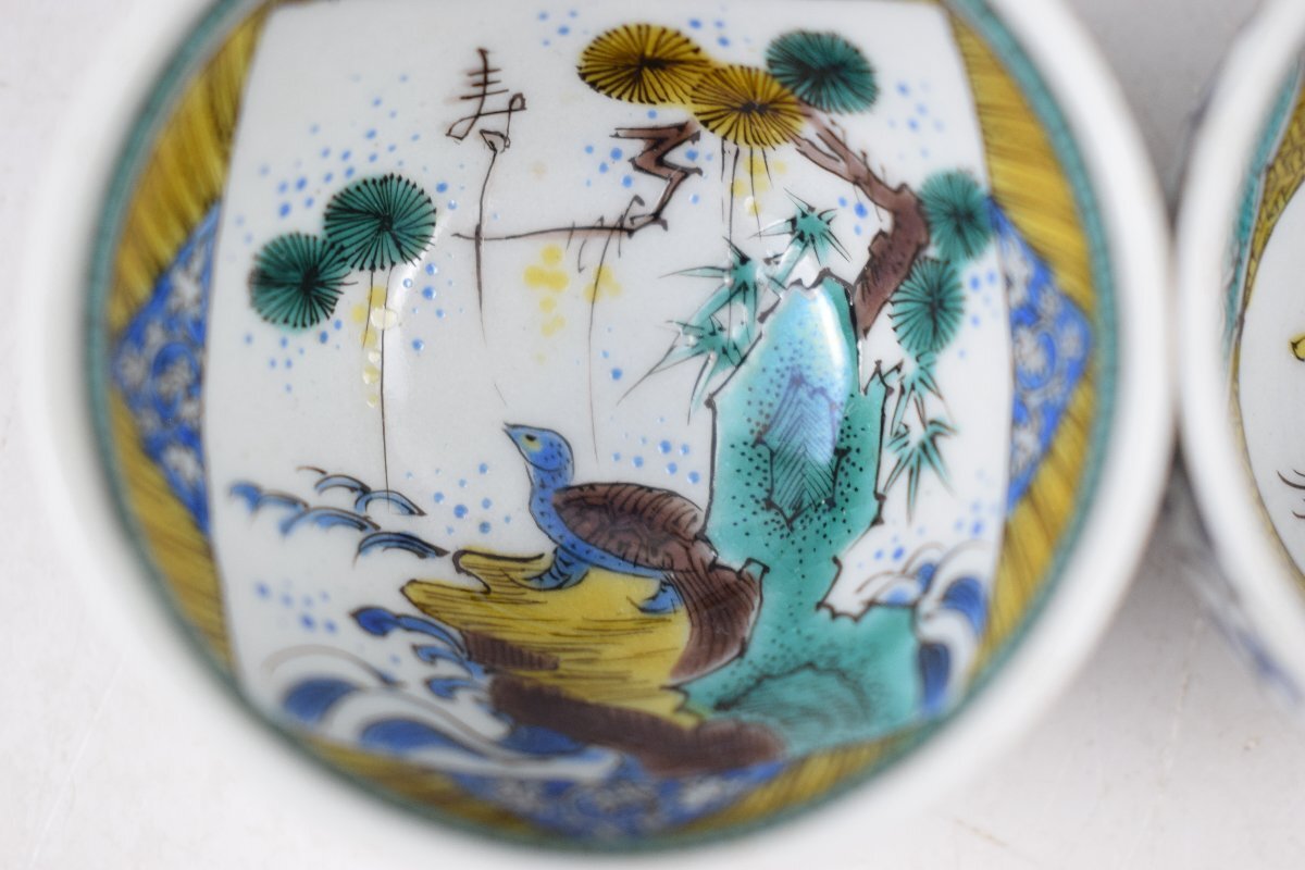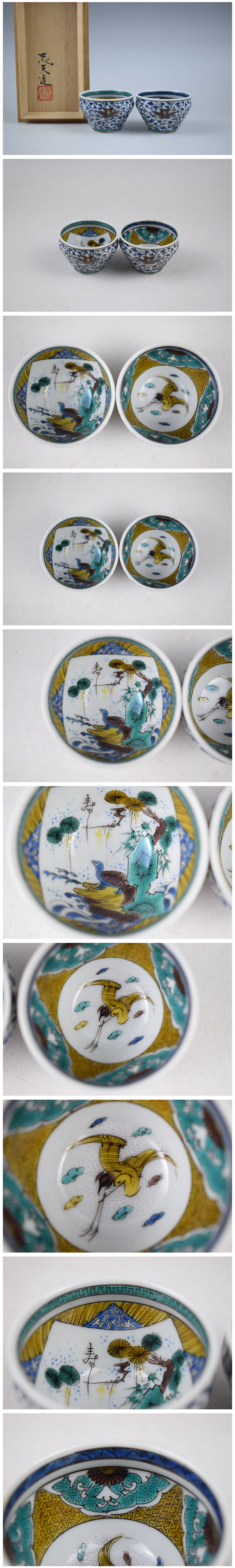E608 宮本忠夫 九谷焼 細密画 色絵九谷絵変酒盃 鶴亀図 二客揃 共箱 真作保証