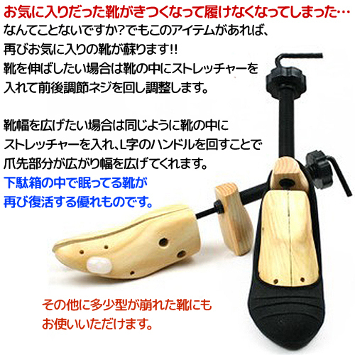 | ※こちらはシューズストレッチャー片方のみの出品となります。 2点セットは別ページにて出品しております。 シューズストレッチャー 商品説明お気に入りだった靴がきつくなって履けなくなってしまった…。 なんてことないですか?でもこのアイテムがあれば、再びお気に入りの靴が蘇ります!! 靴を伸ばしたい場合は靴の中にストレッチャーを入れて前後調節ネジを回し調整します。 靴幅を広げたい場合は同じように靴の中にストレッチャーを入れ、 L字のハンドルを回すことで爪先部分が広がり幅を広げてくれます。 下駄箱の中で眠ってる靴が再び復活する優れものです。 セットした状態で少なくとも2日間は放置してください。さらに広げたいときは繰り返しセットしてお使いください。 ※注意・・広げすぎにご注意ください。靴が破損する恐れがあります。 サイズ 【適用サイズ】24.5-25.5cm 【商品サイズ】 約36.5×6.5×6cm 材質本体/パイン材、スチール ダボ:ポリプロピレン |