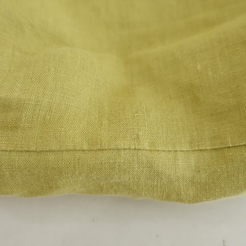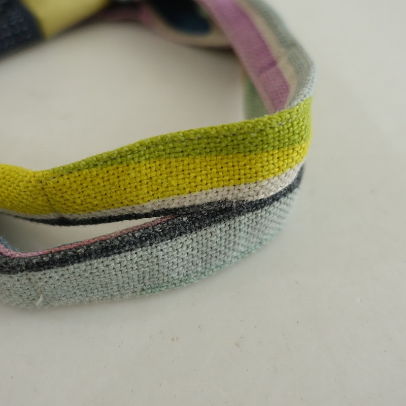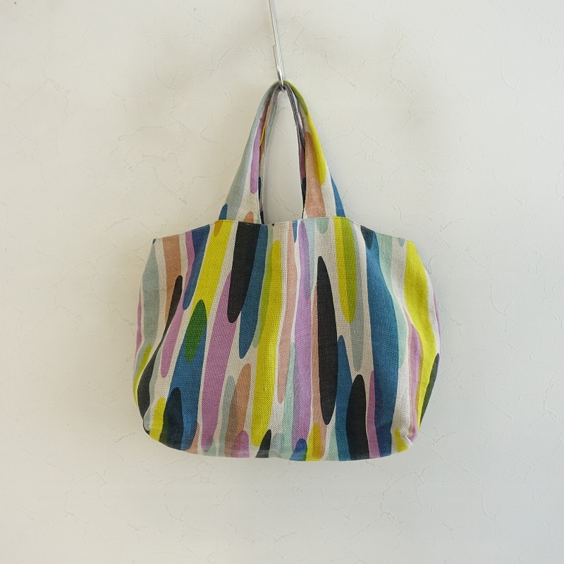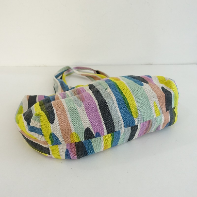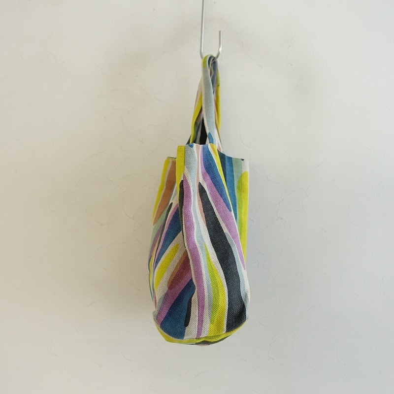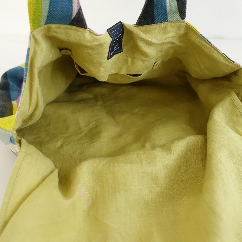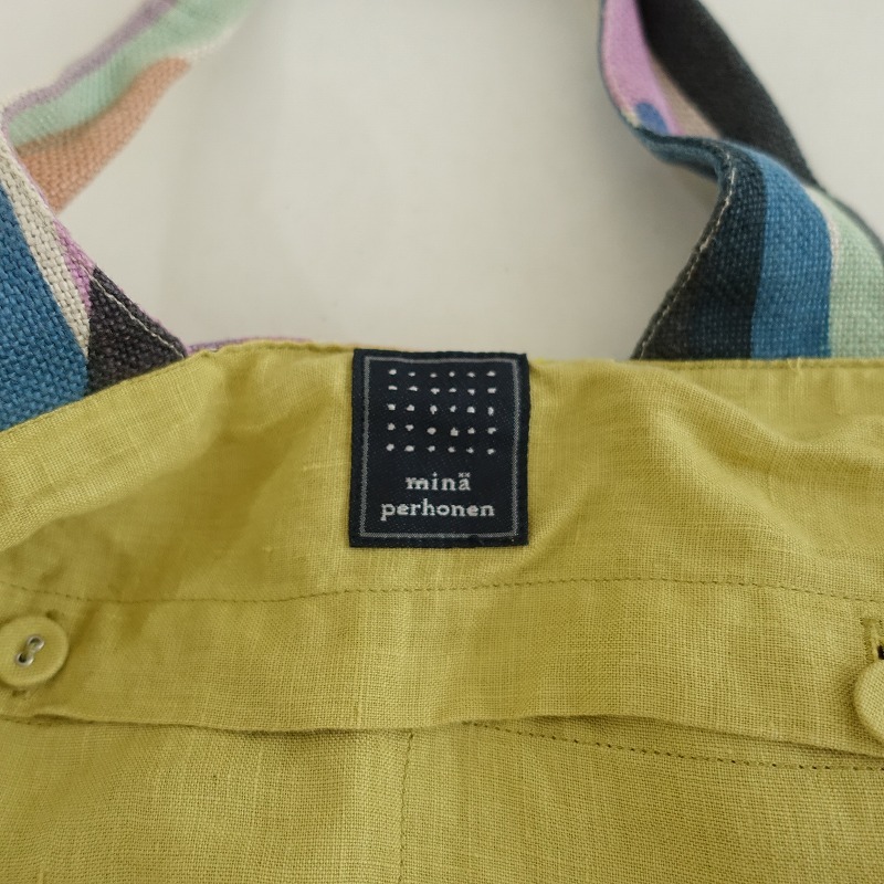 mina perhonenのwater fallパニーニバッグです。カラーはカラーはナチュラルベージュベースにイエロー・ミントグリーン・ブルーなどの総柄テキスタイルで、内側にはくすみイエローの裏地とピンクのchouchoのワンポイント刺繍が施された被せ&ボタン開閉のポケットが2つございます。素材は表生地・裏生地ともに麻100%です。 |