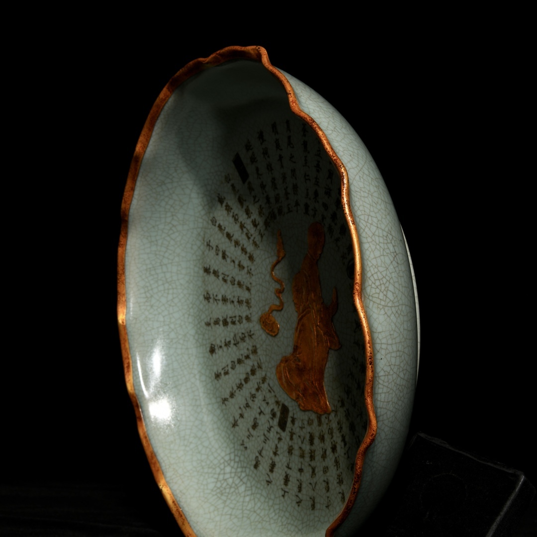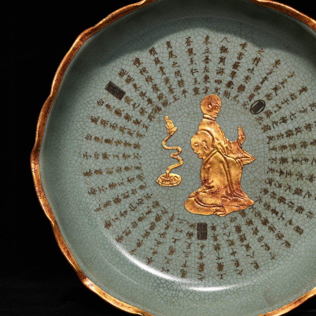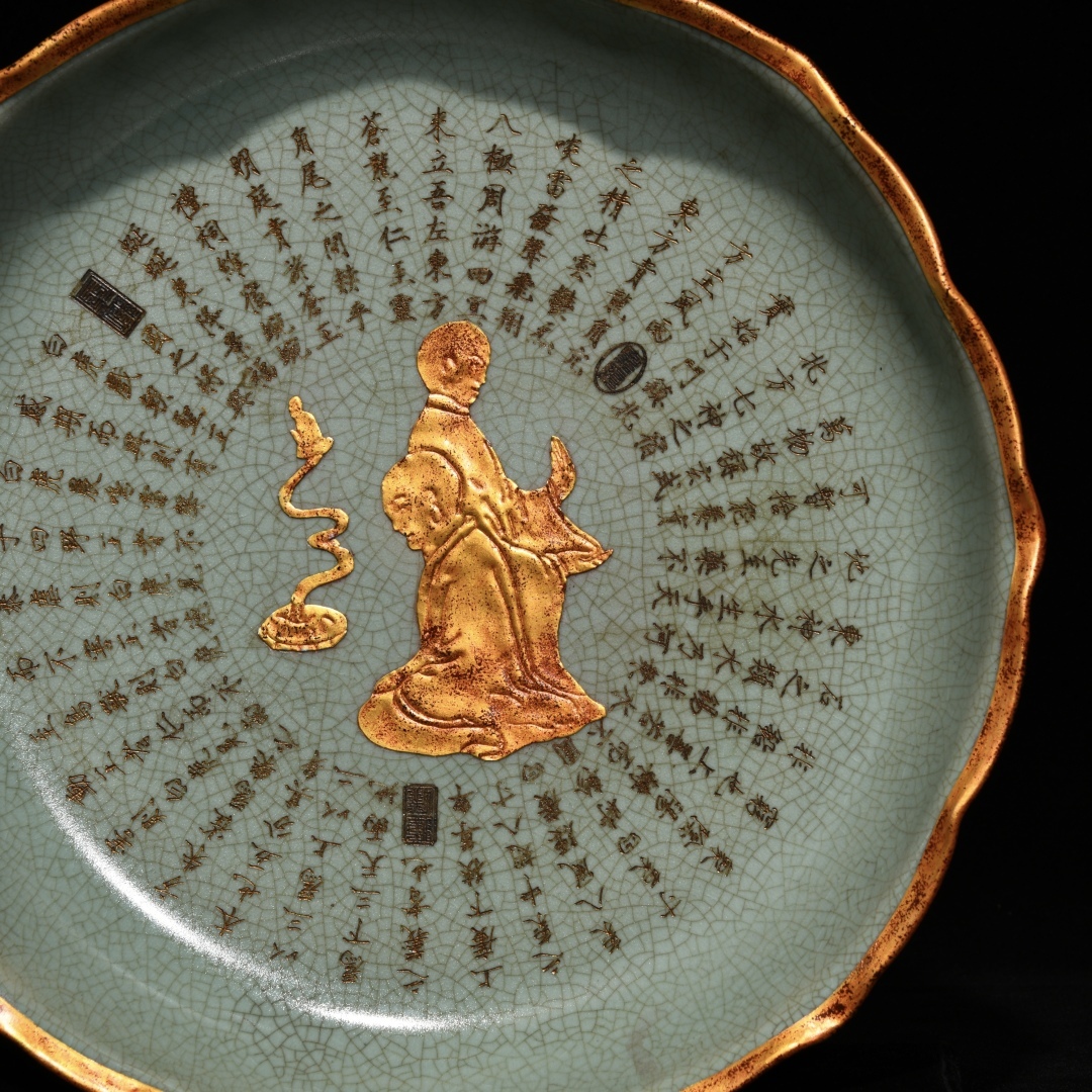 人間国宝209670 中国骨董 磁器【宋汝窯の金象嵌経文花縁皿】工芸品 施釉陶 青花磁 陶芸 本物 古美術 旧蔵 珍品