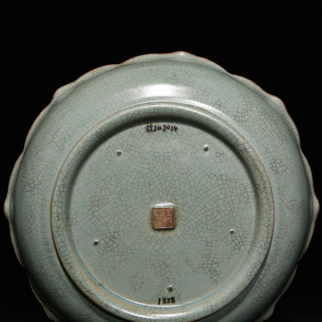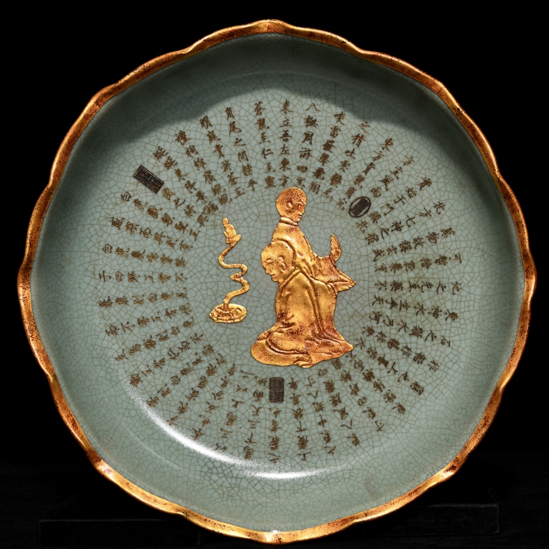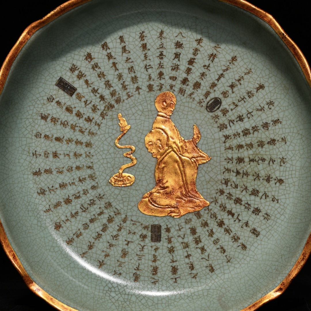 人間国宝209670 中国骨董 磁器【宋汝窯の金象嵌経文花縁皿】工芸品 施釉陶 青花磁 陶芸 本物 古美術 旧蔵 珍品