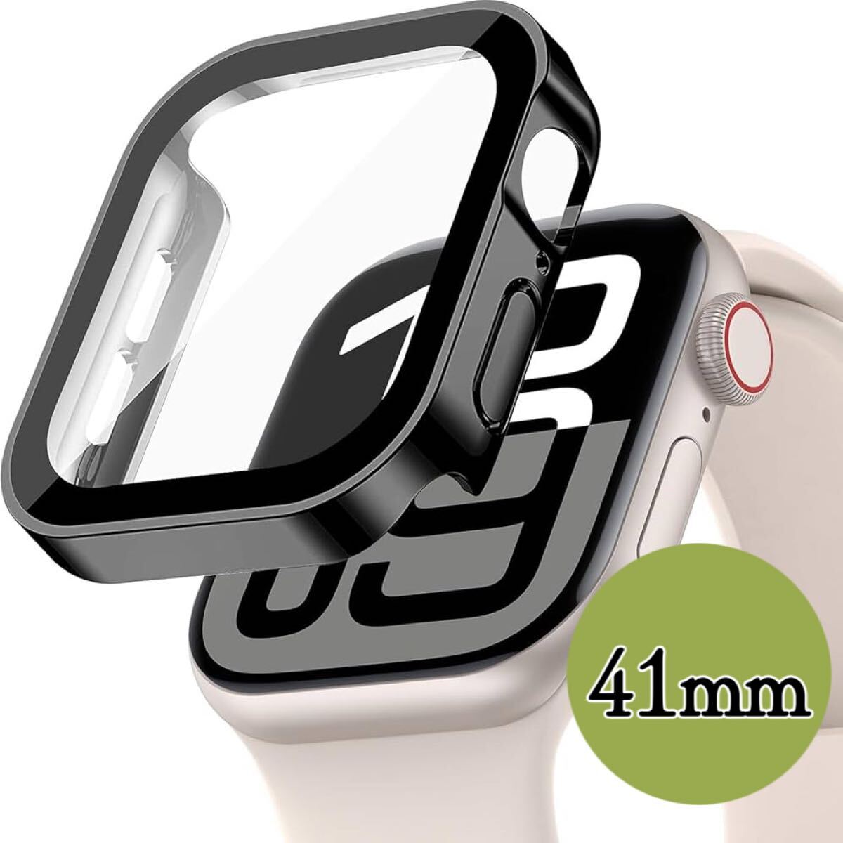 Apple watch ケース 防水 3D直角エッジ 超薄型 PC+ガラス素材 キズ防止 全面保護 光沢のブラック 41mm