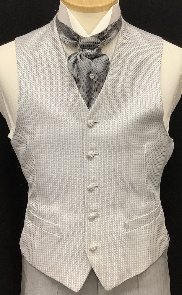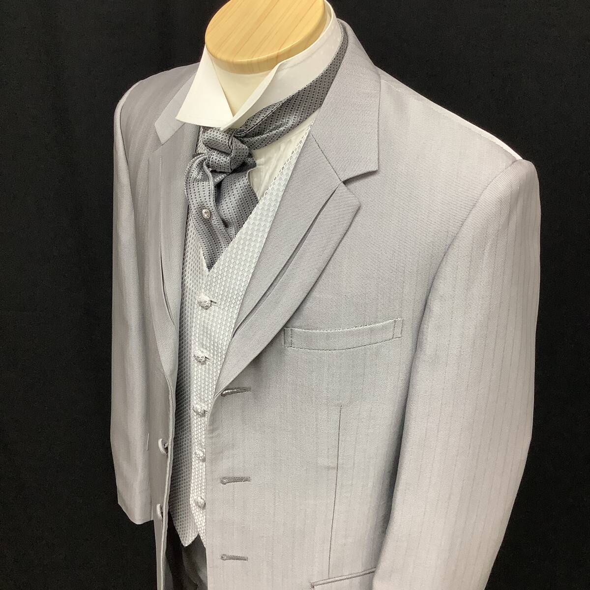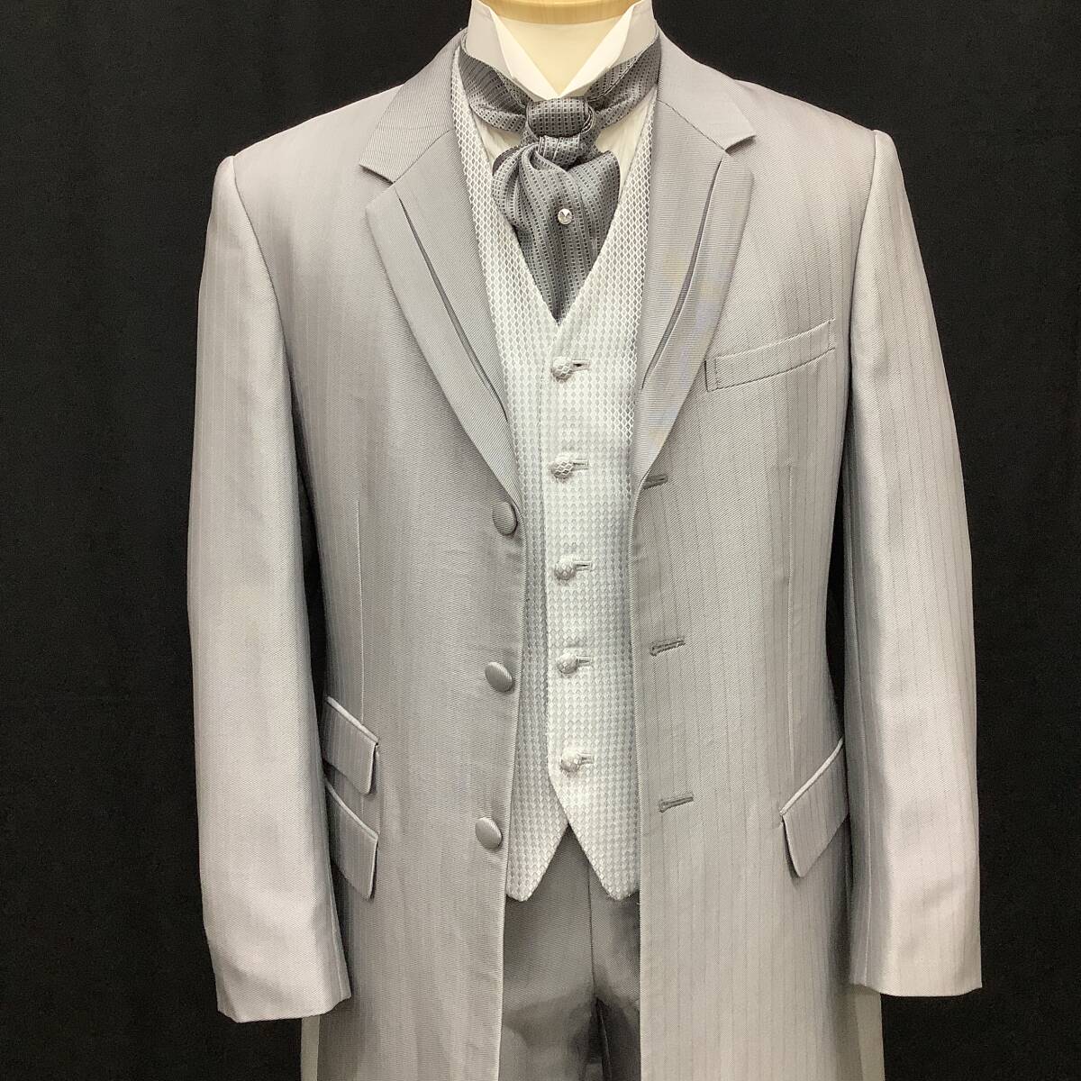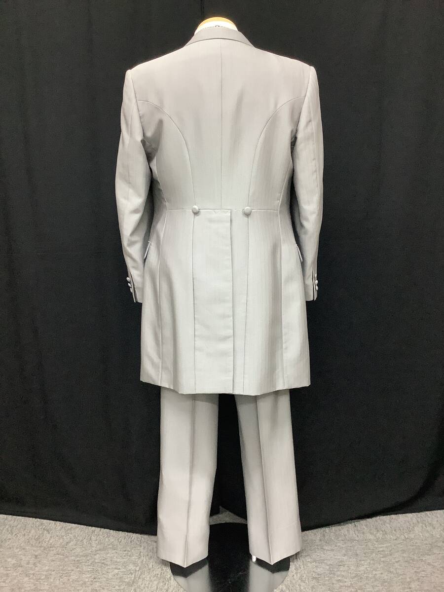 高身長の方用サイズA-3L★ライトグレーのシャドーストライプ★クラシカルなロングタキシード、シルバーグレーの細かな柄ベスト、グレータイ付 レンタル衣裳店で使用・手入れされていた新郎用タキシード 専門店で管理されていた衣裳ですので状態は良い方です メンズメーカー「マツオ」の商品、表示サイズはA-3L 上衣・べスト・パンツのスリーピースとタイのセット 色は明るめグレーで、シャドーストライプ 上衣は剣衿、下衿中央はボックスになっていて割れているように見えるデザイン 両脇のポケットは飾りでフラップ付、右側には2ヶ、背はセンターベント 前袷・袖口には包みボタン、前は3ヶ袖口は3ヶづつ、背中央にも飾りボタン ベストは白に近いシルバーにグレーの細かな菱柄、両脇にポケット付 5ヶのボタンは共生地の包み 上衣と共生地のパンツはタックがひとつ、ウエストはアジャスター付きでサイズ調節可能 タイは細かな柄の濃いめグレーで中央にクリスタルピン付き ワンタッチの着脱式 【注意】写真のYシャツはセットではありません 写真は同型の別タキシードのものを利用、色デザインとも同じです モニター等により色合いが多少違っています、ご了承下さい 【寸法】A-3Lサイズ 173258 実寸法と計測方法は以下の通りです 着用される方のスーツ等で寸法を確認してください 計り方で多少の誤差が出ると思います 上着丈97cm位 袖丈65.5cm位 肩巾49.5cm位 ウエスト82.5~98.5cm位 股下89cm位 【計測方法】 肩巾・・・背中側の左右の袖の縫いつけを直線で計測 袖丈・・・袖の縫いつけから袖口までを真下で計測 上着丈・・・衿の縫い目から裾までを計測。 ウエスト・・・パンツの内側の周囲を計測 股下・・・・股の付け根から裾までを真下で計測 ※ヌード寸法ではありません。現品を当方で実測しています 【状態について】 特に目立つような汚れやシミ等はありません 全体的にはきれいで良好な状態です ただ、あくまでも貸衣裳で使用していた中古品です ご了承の上でご入札お願いいたします | |||