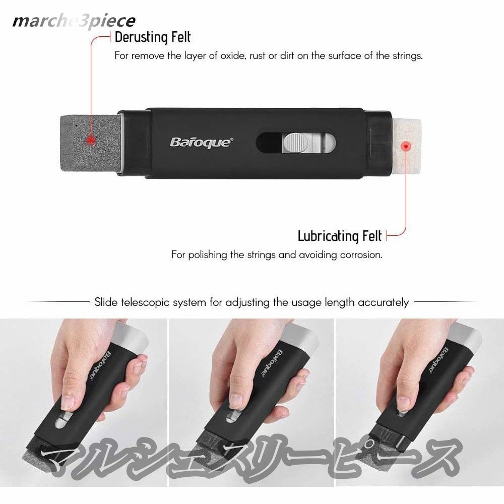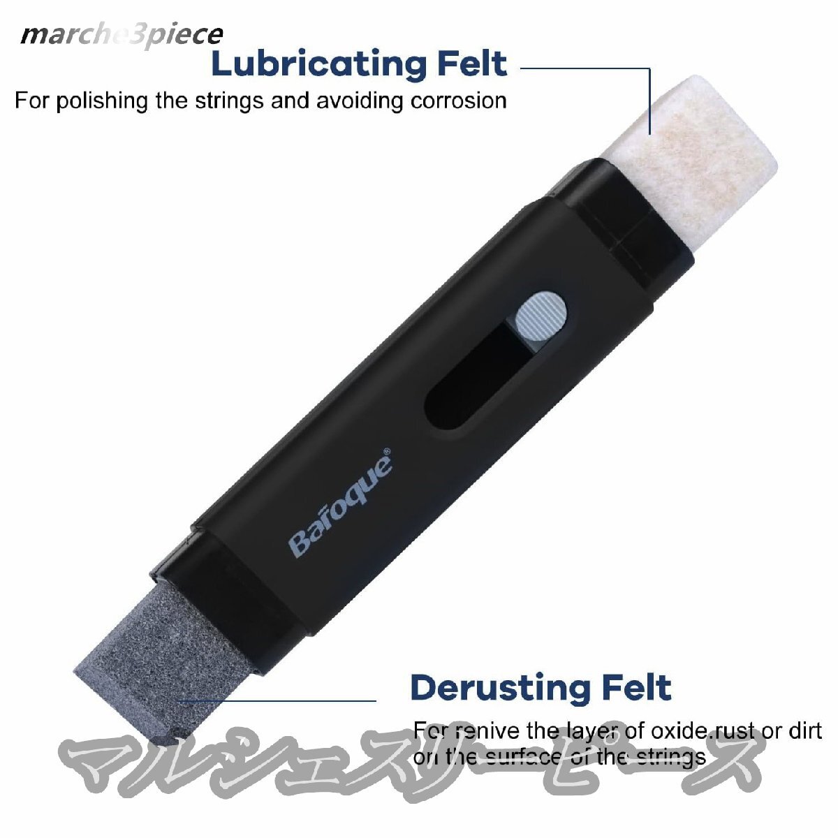 ダブルヘッド設計 & 2WAY機能: 一方のヘッドで弦の錆落とし、もう一方のフェルトブラシヘッドは潤滑油を含ませて防錆処理が可能です。